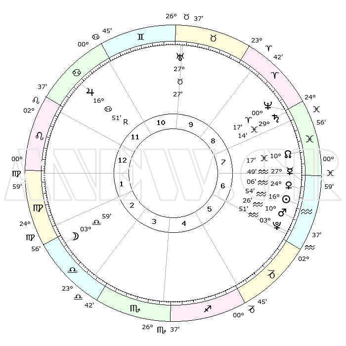 | | ΘΕΣΕΙΣ ΠΛΑΝΗΤΩΝ ΑΣΤΡΟΛΟΓΙΚΟΥ ΧΑΡΤΗ ΤΗΣ ΣΤΙΓΜΗΣ ΑΥΤΗΣ | | | | Πλανήτης | Ζώδιο | Μοίρες | Δεκαήμ. | Σε οίκο | Απόκλιση | | Ακμές των οίκων | | Ηλιος | Υδροχόος | 16°50' | Δεύτερο | 7 | 15 S 47 | | 1ος | 11°15' | Λέων | | Σελήνη | Ζυγός | 03°07' | Πρώτο | 3 | 03 S 12 | | 2ος | 03°12' | Παρθένος | | Ερμής | Υδροχόος | 27°42' | Τρίτο | 7 | 13 S 40 | | 3ος | 29°45' | Παρθένος | | Αφροδίτη | Υδροχόος | 24°00' | Τρίτο | 7 | 14 S 51 | | 4ος | 01°55' | Σκορπιός | | Αρης | Υδροχόος | 10°22' | Δεύτερο | 6 | 18 S 39 | | 5ος | 07°27' | Τοξότης | | Δίας | Καρκίνος | 16°52'R | Δεύτερο | 12 | 22 N 41 | | 6ος | 11°26' | Αιγόκερως | | Κρόνος | Ιχθείς | 29°13' | Τρίτο | 8 | 02 S 18 | | 7ος | 11°15' | Υδροχόος | | Ουρανός | Ταύρος | 27°27' | Τρίτο | 10 | 19 N 24 | | 8ος | 03°12' | Ιχθείς | | Ποσειδώνας | Κριός | 00°17' | Πρώτο | 9 | 01 S 06 | | 9ος | 29°45' | Ιχθείς | | Πλούτωνας | Υδροχόος | 03°51' | Πρώτο | 6 | 23 S 00 | | 10ος | 01°55' | Ταύρος | | Β. Δεσμός | Ιχθείς | 10°17' | Δεύτερο | 8 | 07 S 43 | | 11ος | 07°27' | Δίδυμοι | | Ωροσκόπος | Λέων | 11°15' | Δεύτερο | | | 12ος | 11°26' | Καρκίνος | | Μεσουράνημα | Ταύρος | 01°55' | Πρώτο | | | |