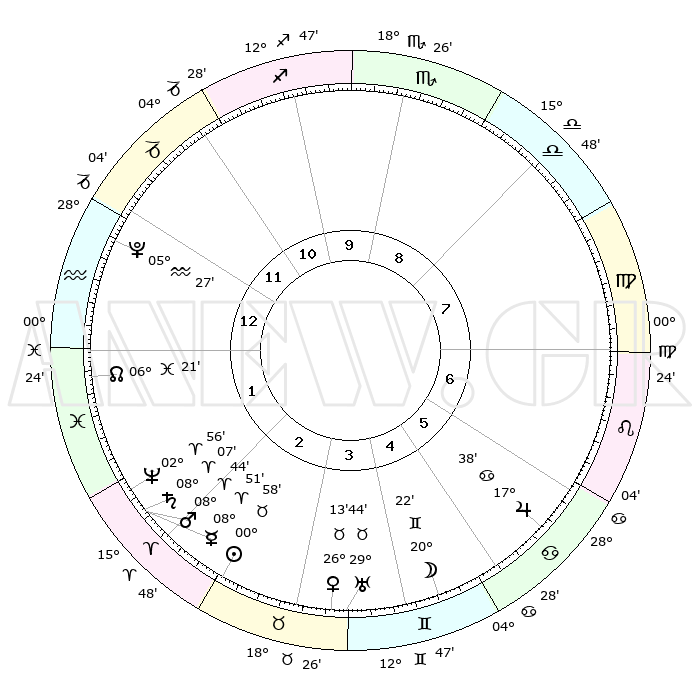 | | ΘΕΣΕΙΣ ΠΛΑΝΗΤΩΝ ΑΣΤΡΟΛΟΓΙΚΟΥ ΧΑΡΤΗ ΤΗΣ ΣΤΙΓΜΗΣ ΑΥΤΗΣ | | | | Πλανήτης | Ζώδιο | Μοίρες | Δεκαήμ. | Σε οίκο | Απόκλιση | | Ακμές των οίκων | | Ηλιος | Ταύρος | 00°54' | Πρώτο | 3 | 11 N 47 | | 1ος | 29°21' | Αιγόκερως | | Σελήνη | Δίδυμοι | 19°25' | Δεύτερο | 5 | 27 N 59 | | 2ος | 13°21' | Ιχθείς | | Ερμής | Κριός | 08°45' | Πρώτο | 2 | 01 N 04 | | 3ος | 21°54' | Κριός | | Αφροδίτη | Ταύρος | 26°08' | Τρίτο | 4 | 19 N 43 | | 4ος | 20°28' | Ταύρος | | Αρης | Κριός | 08°41' | Πρώτο | 2 | 02 N 34 | | 5ος | 13°17' | Δίδυμοι | | Δίας | Καρκίνος | 17°38' | Δεύτερο | 6 | 22 N 39 | | 6ος | 04°40' | Καρκίνος | | Κρόνος | Κριός | 08°06' | Πρώτο | 2 | 01 N 14 | | 7ος | 29°21' | Καρκίνος | | Ουρανός | Ταύρος | 29°44' | Τρίτο | 4 | 19 N 56 | | 8ος | 13°21' | Παρθένος | | Ποσειδώνας | Κριός | 02°56' | Πρώτο | 2 | 00 S 02 | | 9ος | 21°54' | Ζυγός | | Πλούτωνας | Υδροχόος | 05°27' | Πρώτο | 1 | 22 S 48 | | 10ος | 20°28' | Σκορπιός | | Β. Δεσμός | Ιχθείς | 06°21' | Πρώτο | 1 | 09 S 11 | | 11ος | 13°17' | Τοξότης | | Ωροσκόπος | Αιγόκερως | 29°21' | Τρίτο | | | 12ος | 04°40' | Αιγόκερως | | Μεσουράνημα | Σκορπιός | 20°28' | Τρίτο | | | |