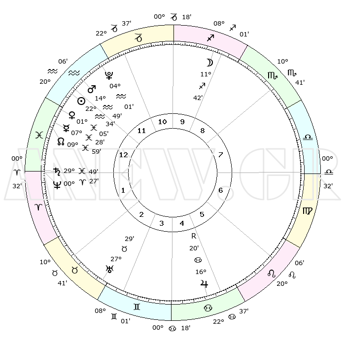 | | ΘΕΣΕΙΣ ΠΛΑΝΗΤΩΝ ΑΣΤΡΟΛΟΓΙΚΟΥ ΧΑΡΤΗ ΤΗΣ ΣΤΙΓΜΗΣ ΑΥΤΗΣ | | | | Πλανήτης | Ζώδιο | Μοίρες | Δεκαήμ. | Σε οίκο | Απόκλιση | | Ακμές των οίκων | | Ηλιος | Υδροχόος | 22°30' | Τρίτο | 12 | 14 S 01 | | 1ος | 26°13' | Υδροχόος | | Σελήνη | Τοξότης | 10°59' | Δεύτερο | 10 | 27 S 17 | | 2ος | 11°53' | Κριός | | Ερμής | Ιχθείς | 07°22' | Πρώτο | 1 | 09 S 27 | | 3ος | 15°21' | Ταύρος | | Αφροδίτη | Ιχθείς | 01°01' | Πρώτο | 1 | 12 S 28 | | 4ος | 10°08' | Δίδυμοι | | Αρης | Υδροχόος | 14°46' | Δεύτερο | 12 | 17 S 26 | | 5ος | 01°51' | Καρκίνος | | Δίας | Καρκίνος | 16°20'R | Δεύτερο | 5 | 22 N 45 | | 6ος | 25°02' | Καρκίνος | | Κρόνος | Ιχθείς | 29°49' | Τρίτο | 1 | 02 S 03 | | 7ος | 26°13' | Λέων | | Ουρανός | Ταύρος | 27°29' | Τρίτο | 3 | 19 N 25 | | 8ος | 11°53' | Ζυγός | | Ποσειδώνας | Κριός | 00°27' | Πρώτο | 1 | 01 S 02 | | 9ος | 15°21' | Σκορπιός | | Πλούτωνας | Υδροχόος | 04°01' | Πρώτο | 12 | 22 S 58 | | 10ος | 10°08' | Τοξότης | | Β. Δεσμός | Ιχθείς | 09°59' | Πρώτο | 1 | 07 S 49 | | 11ος | 01°51' | Αιγόκερως | | Ωροσκόπος | Υδροχόος | 26°13' | Τρίτο | | | 12ος | 25°02' | Αιγόκερως | | Μεσουράνημα | Τοξότης | 10°08' | Δεύτερο | | | |