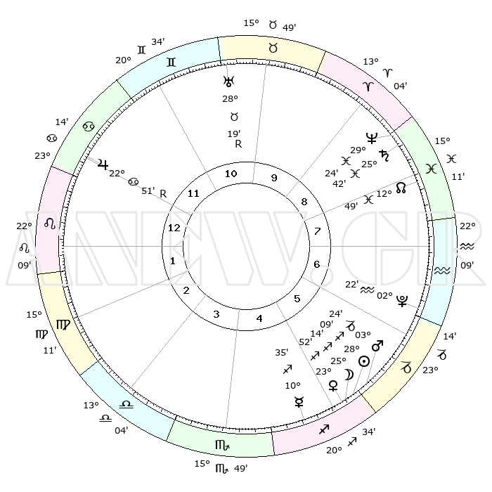 | | ΘΕΣΕΙΣ ΠΛΑΝΗΤΩΝ ΑΣΤΡΟΛΟΓΙΚΟΥ ΧΑΡΤΗ ΤΗΣ ΣΤΙΓΜΗΣ ΑΥΤΗΣ | | | | Πλανήτης | Ζώδιο | Μοίρες | Δεκαήμ. | Σε οίκο | Απόκλιση | | Ακμές των οίκων | | Ηλιος | Τοξότης | 28°05' | Τρίτο | 5 | 23 S 25 | | 1ος | 02°26' | Λέων | | Σελήνη | Τοξότης | 24°25' | Τρίτο | 5 | 28 S 12 | | 2ος | 23°38' | Λέων | | Ερμής | Τοξότης | 10°29' | Δεύτερο | 5 | 21 S 06 | | 3ος | 19°01' | Παρθένος | | Αφροδίτη | Τοξότης | 23°47' | Τρίτο | 5 | 23 S 19 | | 4ος | 20°21' | Ζυγός | | Αρης | Αιγόκερως | 03°21' | Πρώτο | 6 | 24 S 12 | | 5ος | 26°19' | Σκορπιός | | Δίας | Καρκίνος | 22°51'R | Τρίτο | 12 | 21 N 42 | | 6ος | 01°38' | Αιγόκερως | | Κρόνος | Ιχθείς | 25°42' | Τρίτο | 9 | 03 S 49 | | 7ος | 02°26' | Υδροχόος | | Ουρανός | Ταύρος | 28°20'R | Τρίτο | 11 | 19 N 35 | | 8ος | 23°38' | Υδροχόος | | Ποσειδώνας | Ιχθείς | 29°24' | Τρίτο | 9 | 01 S 28 | | 9ος | 19°01' | Ιχθείς | | Πλούτωνας | Υδροχόος | 02°22' | Πρώτο | 6 | 23 S 18 | | 10ος | 20°21' | Κριός | | Β. Δεσμός | Ιχθείς | 12°49' | Δεύτερο | 8 | 06 S 45 | | 11ος | 26°19' | Ταύρος | | Ωροσκόπος | Λέων | 02°26' | Πρώτο | | | 12ος | 01°38' | Καρκίνος | | Μεσουράνημα | Κριός | 20°21' | Τρίτο | | | |