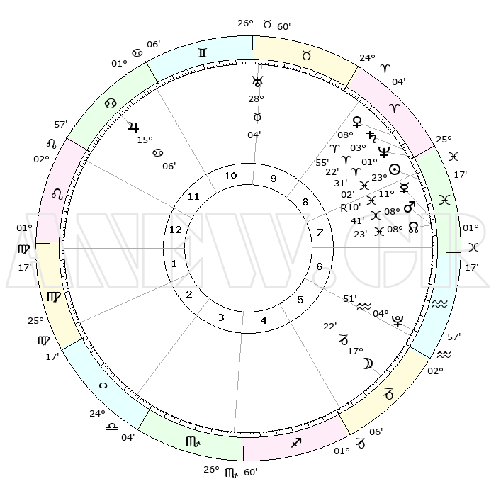 | | ΘΕΣΕΙΣ ΠΛΑΝΗΤΩΝ ΑΣΤΡΟΛΟΓΙΚΟΥ ΧΑΡΤΗ ΤΗΣ ΣΤΙΓΜΗΣ ΑΥΤΗΣ | | | | Πλανήτης | Ζώδιο | Μοίρες | Δεκαήμ. | Σε οίκο | Απόκλιση | | Ακμές των οίκων | | Ηλιος | Ιχθείς | 22°59' | Τρίτο | 8 | 02 S 47 | | 1ος | 16°11' | Λέων | | Σελήνη | Αιγόκερως | 16°44' | Δεύτερο | 5 | 26 S 31 | | 2ος | 08°36' | Παρθένος | | Ερμής | Ιχθείς | 11°12'R | Δεύτερο | 8 | 04 S 50 | | 3ος | 05°47' | Ζυγός | | Αφροδίτη | Κριός | 08°51' | Πρώτο | 9 | 02 N 30 | | 4ος | 08°17' | Σκορπιός | | Αρης | Ιχθείς | 08°39' | Πρώτο | 8 | 09 S 20 | | 5ος | 13°28' | Τοξότης | | Δίας | Καρκίνος | 15°06' | Δεύτερο | 11 | 22 N 56 | | 6ος | 16°48' | Αιγόκερως | | Κρόνος | Κριός | 03°22' | Πρώτο | 8 | 00 S 37 | | 7ος | 16°11' | Υδροχόος | | Ουρανός | Ταύρος | 28°04' | Τρίτο | 10 | 19 N 33 | | 8ος | 08°36' | Ιχθείς | | Ποσειδώνας | Κριός | 01°31' | Πρώτο | 8 | 00 S 36 | | 9ος | 05°47' | Κριός | | Πλούτωνας | Υδροχόος | 04°51' | Πρώτο | 6 | 22 S 50 | | 10ος | 08°16' | Ταύρος | | Β. Δεσμός | Ιχθείς | 08°23' | Πρώτο | 7 | 08 S 26 | | 11ος | 13°28' | Δίδυμοι | | Ωροσκόπος | Λέων | 16°11' | Δεύτερο | | | 12ος | 16°48' | Καρκίνος | | Μεσουράνημα | Ταύρος | 08°16' | Πρώτο | | | |