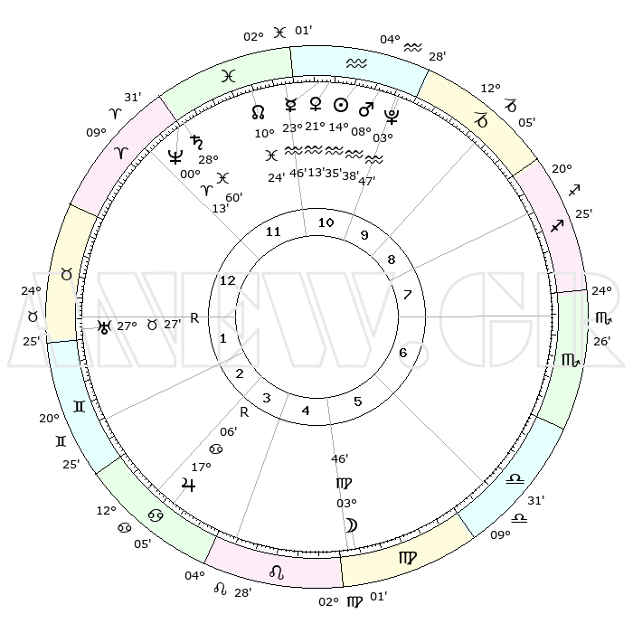 | | ΘΕΣΕΙΣ ΠΛΑΝΗΤΩΝ ΑΣΤΡΟΛΟΓΙΚΟΥ ΧΑΡΤΗ ΤΗΣ ΣΤΙΓΜΗΣ ΑΥΤΗΣ | | | | Πλανήτης | Ζώδιο | Μοίρες | Δεκαήμ. | Σε οίκο | Απόκλιση | | Ακμές των οίκων | | Ηλιος | Υδροχόος | 14°31' | Δεύτερο | 11 | 16 S 28 | | 1ος | 24°49' | Κριός | | Σελήνη | Παρθένος | 02°58' | Πρώτο | 5 | 10 N 56 | | 2ος | 28°28' | Ταύρος | | Ερμής | Υδροχόος | 23°39' | Τρίτο | 11 | 15 S 15 | | 3ος | 22°35' | Δίδυμοι | | Αφροδίτη | Υδροχόος | 21°09' | Τρίτο | 11 | 15 S 46 | | 4ος | 14°17' | Καρκίνος | | Αρης | Υδροχόος | 08°35' | Πρώτο | 11 | 19 S 08 | | 5ος | 08°11' | Λέων | | Δίας | Καρκίνος | 17°06'R | Δεύτερο | 4 | 22 N 39 | | 6ος | 09°54' | Παρθένος | | Κρόνος | Ιχθείς | 28°59' | Τρίτο | 12 | 02 S 24 | | 7ος | 24°49' | Ζυγός | | Ουρανός | Ταύρος | 27°27'R | Τρίτο | 1 | 19 N 24 | | 8ος | 28°28' | Σκορπιός | | Ποσειδώνας | Κριός | 00°13' | Πρώτο | 12 | 01 S 07 | | 9ος | 22°35' | Τοξότης | | Πλούτωνας | Υδροχόος | 03°47' | Πρώτο | 10 | 23 S 00 | | 10ος | 14°16' | Αιγόκερως | | Β. Δεσμός | Ιχθείς | 10°24' | Δεύτερο | 12 | 07 S 40 | | 11ος | 08°11' | Υδροχόος | | Ωροσκόπος | Κριός | 24°49' | Τρίτο | | | 12ος | 09°54' | Ιχθείς | | Μεσουράνημα | Αιγόκερως | 14°16' | Δεύτερο | | | |