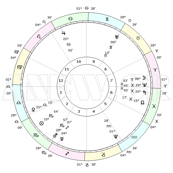 | | ΘΕΣΕΙΣ ΠΛΑΝΗΤΩΝ ΑΣΤΡΟΛΟΓΙΚΟΥ ΧΑΡΤΗ ΤΗΣ ΣΤΙΓΜΗΣ ΑΥΤΗΣ | | | | Πλανήτης | Ζώδιο | Μοίρες | Δεκαήμ. | Σε οίκο | Απόκλιση | | Ακμές των οίκων | | Ηλιος | Σκορπιός | 10°23' | Δεύτερο | 8 | 14 S 56 | | 1ος | 29°15' | Ιχθείς | | Σελήνη | Ιχθείς | 28°44' | Τρίτο | 12 | 00 N 27 | | 2ος | 09°43' | Ταύρος | | Ερμής | Τοξότης | 03°44' | Πρώτο | 8 | 23 S 44 | | 3ος | 07°14' | Δίδυμοι | | Αφροδίτη | Ζυγός | 24°32' | Τρίτο | 7 | 08 S 09 | | 4ος | 29°35' | Δίδυμοι | | Αρης | Σκορπιός | 28°36' | Τρίτο | 8 | 20 S 14 | | 5ος | 21°51' | Καρκίνος | | Δίας | Καρκίνος | 25°01' | Τρίτο | 5 | 21 N 13 | | 6ος | 19°08' | Λέων | | Κρόνος | Ιχθείς | 25°51'R | Τρίτο | 12 | 03 S 54 | | 7ος | 29°15' | Παρθένος | | Ουρανός | Δίδυμοι | 00°13'R | Πρώτο | 2 | 19 N 59 | | 8ος | 09°43' | Σκορπιός | | Ποσειδώνας | Ιχθείς | 29°45'R | Τρίτο | 1 | 01 S 21 | | 9ος | 07°14' | Τοξότης | | Πλούτωνας | Υδροχόος | 01°27' | Πρώτο | 11 | 23 S 31 | | 10ος | 29°35' | Τοξότης | | Β. Δεσμός | Ιχθείς | 15°19' | Δεύτερο | 12 | 05 S 47 | | 11ος | 21°51' | Αιγόκερως | | Ωροσκόπος | Ιχθείς | 29°15' | Τρίτο | | | 12ος | 19°08' | Υδροχόος | | Μεσουράνημα | Τοξότης | 29°35' | Τρίτο | | | |