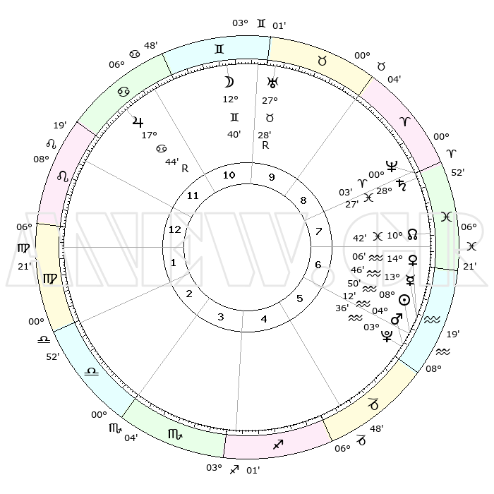 | | ΘΕΣΕΙΣ ΠΛΑΝΗΤΩΝ ΑΣΤΡΟΛΟΓΙΚΟΥ ΧΑΡΤΗ ΤΗΣ ΣΤΙΓΜΗΣ ΑΥΤΗΣ | | | | Πλανήτης | Ζώδιο | Μοίρες | Δεκαήμ. | Σε οίκο | Απόκλιση | | Ακμές των οίκων | | Ηλιος | Υδροχόος | 08°45' | Πρώτο | 6 | 18 S 04 | | 1ος | 14°22' | Λέων | | Σελήνη | Δίδυμοι | 11°35' | Δεύτερο | 11 | 27 N 19 | | 2ος | 06°37' | Παρθένος | | Ερμής | Υδροχόος | 13°38' | Δεύτερο | 6 | 18 S 40 | | 3ος | 03°35' | Ζυγός | | Αφροδίτη | Υδροχόος | 14°01' | Δεύτερο | 6 | 17 S 52 | | 4ος | 05°57' | Σκορπιός | | Αρης | Υδροχόος | 04°08' | Πρώτο | 6 | 20 S 13 | | 5ος | 11°17' | Τοξότης | | Δίας | Καρκίνος | 17°44'R | Δεύτερο | 12 | 22 N 33 | | 6ος | 14°50' | Αιγόκερως | | Κρόνος | Ιχθείς | 28°26' | Τρίτο | 8 | 02 S 37 | | 7ος | 14°22' | Υδροχόος | | Ουρανός | Ταύρος | 27°29'R | Τρίτο | 10 | 19 N 24 | | 8ος | 06°37' | Ιχθείς | | Ποσειδώνας | Κριός | 00°03' | Πρώτο | 8 | 01 S 11 | | 9ος | 03°35' | Κριός | | Πλούτωνας | Υδροχόος | 03°36' | Πρώτο | 6 | 23 S 03 | | 10ος | 05°57' | Ταύρος | | Β. Δεσμός | Ιχθείς | 10°42' | Δεύτερο | 8 | 07 S 33 | | 11ος | 11°17' | Δίδυμοι | | Ωροσκόπος | Λέων | 14°22' | Δεύτερο | | | 12ος | 14°50' | Καρκίνος | | Μεσουράνημα | Ταύρος | 05°57' | Πρώτο | | | |