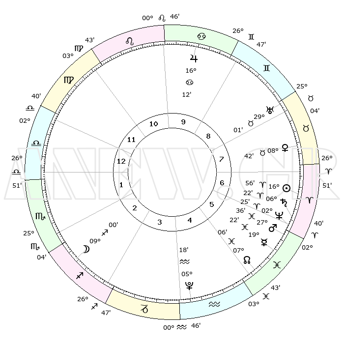 | | ΘΕΣΕΙΣ ΠΛΑΝΗΤΩΝ ΑΣΤΡΟΛΟΓΙΚΟΥ ΧΑΡΤΗ ΤΗΣ ΣΤΙΓΜΗΣ ΑΥΤΗΣ | | | | Πλανήτης | Ζώδιο | Μοίρες | Δεκαήμ. | Σε οίκο | Απόκλιση | | Ακμές των οίκων | | Ηλιος | Κριός | 16°53' | Δεύτερο | 7 | 06 N 38 | | 1ος | 10°21' | Ζυγός | | Σελήνη | Τοξότης | 08°20' | Πρώτο | 2 | 26 S 47 | | 2ος | 07°38' | Σκορπιός | | Ερμής | Ιχθείς | 19°18' | Δεύτερο | 6 | 06 S 07 | | 3ος | 08°28' | Τοξότης | | Αφροδίτη | Ταύρος | 08°38' | Πρώτο | 8 | 14 N 11 | | 4ος | 11°40' | Αιγόκερως | | Αρης | Ιχθείς | 27°34' | Τρίτο | 6 | 01 S 54 | | 5ος | 14°35' | Υδροχόος | | Δίας | Καρκίνος | 16°12' | Δεύτερο | 10 | 22 N 49 | | 6ος | 14°35' | Ιχθείς | | Κρόνος | Κριός | 06°22' | Πρώτο | 6 | 00 N 34 | | 7ος | 10°21' | Κριός | | Ουρανός | Ταύρος | 29°01' | Τρίτο | 8 | 19 N 46 | | 8ος | 07°38' | Ταύρος | | Ποσειδώνας | Κριός | 02°25' | Πρώτο | 6 | 00 S 14 | | 9ος | 08°28' | Δίδυμοι | | Πλούτωνας | Υδροχόος | 05°18' | Πρώτο | 4 | 22 S 47 | | 10ος | 11°40' | Καρκίνος | | Β. Δεσμός | Ιχθείς | 07°06' | Πρώτο | 5 | 08 S 54 | | 11ος | 14°35' | Λέων | | Ωροσκόπος | Ζυγός | 10°21' | Δεύτερο | | | 12ος | 14°35' | Παρθένος | | Μεσουράνημα | Καρκίνος | 11°40' | Δεύτερο | | | |