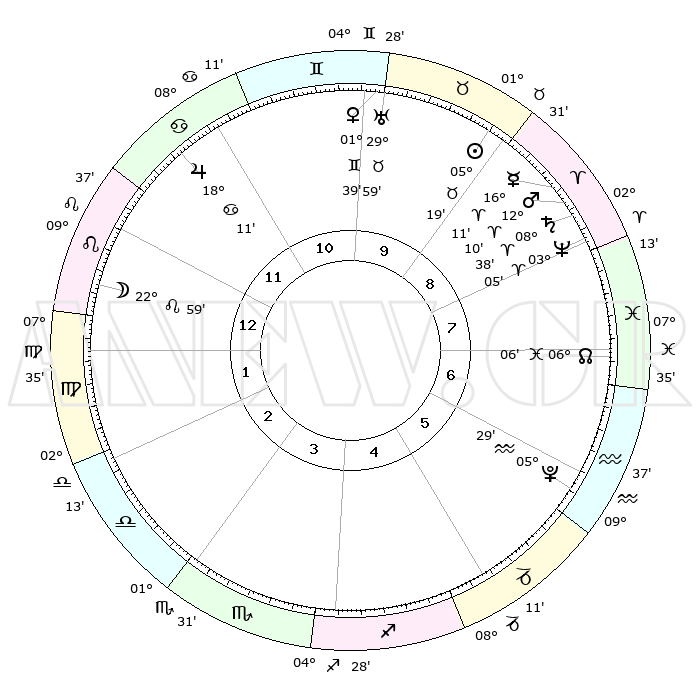 | | ΘΕΣΕΙΣ ΠΛΑΝΗΤΩΝ ΑΣΤΡΟΛΟΓΙΚΟΥ ΧΑΡΤΗ ΤΗΣ ΣΤΙΓΜΗΣ ΑΥΤΗΣ | | | | Πλανήτης | Ζώδιο | Μοίρες | Δεκαήμ. | Σε οίκο | Απόκλιση | | Ακμές των οίκων | | Ηλιος | Ταύρος | 05°15' | Πρώτο | 9 | 13 N 16 | | 1ος | 17°36' | Λέων | | Σελήνη | Λέων | 22°04' | Τρίτο | 1 | 15 N 25 | | 2ος | 10°10' | Παρθένος | | Ερμής | Κριός | 16°04' | Δεύτερο | 9 | 04 N 06 | | 3ος | 07°31' | Ζυγός | | Αφροδίτη | Δίδυμοι | 01°34' | Πρώτο | 10 | 21 N 06 | | 4ος | 10°05' | Σκορπιός | | Αρης | Κριός | 12°07' | Δεύτερο | 9 | 03 N 56 | | 5ος | 15°10' | Τοξότης | | Δίας | Καρκίνος | 18°10' | Δεύτερο | 11 | 22 N 35 | | 6ος | 18°20' | Αιγόκερως | | Κρόνος | Κριός | 08°38' | Πρώτο | 9 | 01 N 26 | | 7ος | 17°36' | Υδροχόος | | Ουρανός | Ταύρος | 29°58' | Τρίτο | 10 | 19 N 59 | | 8ος | 10°10' | Ιχθείς | | Ποσειδώνας | Κριός | 03°05' | Πρώτο | 8 | 00 N 01 | | 9ος | 07°31' | Κριός | | Πλούτωνας | Υδροχόος | 05°29' | Πρώτο | 6 | 22 S 48 | | 10ος | 10°05' | Ταύρος | | Β. Δεσμός | Ιχθείς | 06°07' | Πρώτο | 7 | 09 S 16 | | 11ος | 15°10' | Δίδυμοι | | Ωροσκόπος | Λέων | 17°36' | Δεύτερο | | | 12ος | 18°20' | Καρκίνος | | Μεσουράνημα | Ταύρος | 10°05' | Δεύτερο | | | |