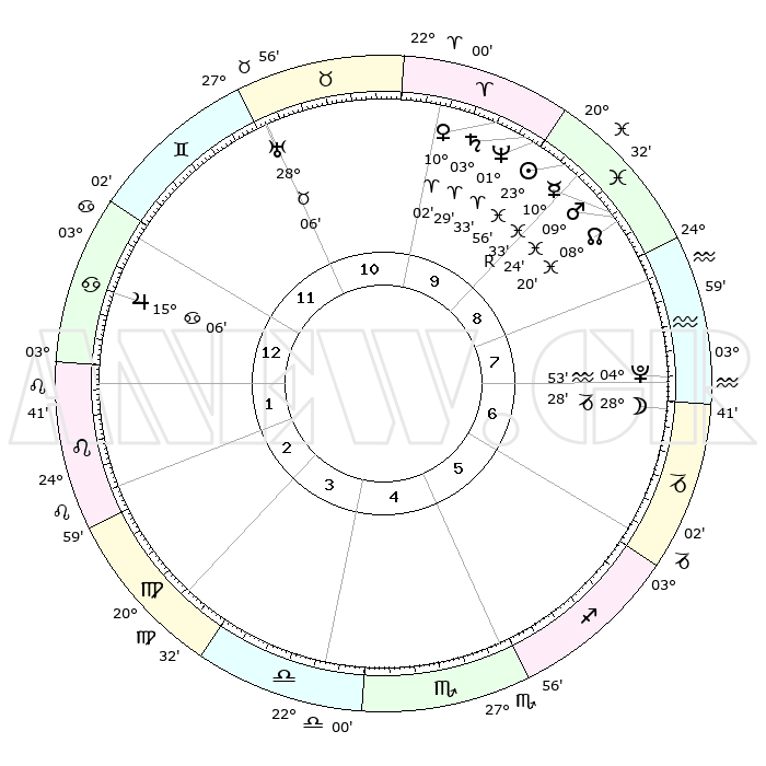 | | ΘΕΣΕΙΣ ΠΛΑΝΗΤΩΝ ΑΣΤΡΟΛΟΓΙΚΟΥ ΧΑΡΤΗ ΤΗΣ ΣΤΙΓΜΗΣ ΑΥΤΗΣ | | | | Πλανήτης | Ζώδιο | Μοίρες | Δεκαήμ. | Σε οίκο | Απόκλιση | | Ακμές των οίκων | | Ηλιος | Ιχθείς | 23°52' | Τρίτο | 9 | 02 S 26 | | 1ος | 15°22' | Καρκίνος | | Σελήνη | Αιγόκερως | 27°42' | Τρίτο | 7 | 24 S 01 | | 2ος | 05°48' | Λέων | | Ερμής | Ιχθείς | 10°35'R | Δεύτερο | 9 | 05 S 15 | | 3ος | 28°59' | Λέων | | Αφροδίτη | Κριός | 09°57' | Πρώτο | 10 | 02 N 58 | | 4ος | 27°51' | Παρθένος | | Αρης | Ιχθείς | 09°21' | Πρώτο | 9 | 09 S 04 | | 5ος | 03°36' | Σκορπιός | | Δίας | Καρκίνος | 15°06' | Δεύτερο | 12 | 22 N 56 | | 6ος | 11°45' | Τοξότης | | Κρόνος | Κριός | 03°29' | Πρώτο | 10 | 00 S 34 | | 7ος | 15°22' | Αιγόκερως | | Ουρανός | Ταύρος | 28°06' | Τρίτο | 11 | 19 N 34 | | 8ος | 05°48' | Υδροχόος | | Ποσειδώνας | Κριός | 01°33' | Πρώτο | 10 | 00 S 35 | | 9ος | 28°59' | Υδροχόος | | Πλούτωνας | Υδροχόος | 04°52' | Πρώτο | 7 | 22 S 50 | | 10ος | 27°51' | Ιχθείς | | Β. Δεσμός | Ιχθείς | 08°20' | Πρώτο | 9 | 08 S 27 | | 11ος | 03°36' | Ταύρος | | Ωροσκόπος | Καρκίνος | 15°22' | Δεύτερο | | | 12ος | 11°45' | Δίδυμοι | | Μεσουράνημα | Ιχθείς | 27°51' | Τρίτο | | | |