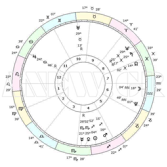 | | ΘΕΣΕΙΣ ΠΛΑΝΗΤΩΝ ΑΣΤΡΟΛΟΓΙΚΟΥ ΧΑΡΤΗ ΤΗΣ ΣΤΙΓΜΗΣ ΑΥΤΗΣ | | | | Πλανήτης | Ζώδιο | Μοίρες | Δεκαήμ. | Σε οίκο | Απόκλιση | | Ακμές των οίκων | | Ηλιος | Τοξότης | 04°50' | Πρώτο | 4 | 21 S 06 | | 1ος | 17°03' | Λέων | | Σελήνη | Υδροχόος | 17°47' | Δεύτερο | 7 | 17 S 39 | | 2ος | 09°33' | Παρθένος | | Ερμής | Σκορπιός | 21°29'R | Τρίτο | 4 | 15 S 58 | | 3ος | 06°51' | Ζυγός | | Αφροδίτη | Σκορπιός | 24°60' | Τρίτο | 4 | 18 S 11 | | 4ος | 09°23' | Σκορπιός | | Αρης | Τοξότης | 16°14' | Δεύτερο | 5 | 23 S 21 | | 5ος | 14°30' | Τοξότης | | Δίας | Καρκίνος | 24°46'R | Τρίτο | 12 | 21 N 19 | | 6ος | 17°44' | Αιγόκερως | | Κρόνος | Ιχθείς | 25°17'R | Τρίτο | 8 | 04 S 04 | | 7ος | 17°03' | Υδροχόος | | Ουρανός | Ταύρος | 29°13'R | Τρίτο | 10 | 19 N 47 | | 8ος | 09°33' | Ιχθείς | | Ποσειδώνας | Ιχθείς | 29°25'R | Τρίτο | 8 | 01 S 28 | | 9ος | 06°51' | Κριός | | Πλούτωνας | Υδροχόος | 01°49' | Πρώτο | 6 | 23 S 25 | | 10ος | 09°23' | Ταύρος | | Β. Δεσμός | Ιχθείς | 14°02' | Δεύτερο | 8 | 06 S 17 | | 11ος | 14°30' | Δίδυμοι | | Ωροσκόπος | Λέων | 17°03' | Δεύτερο | | | 12ος | 17°44' | Καρκίνος | | Μεσουράνημα | Ταύρος | 09°23' | Πρώτο | | | |