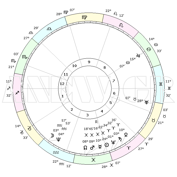 | | ΘΕΣΕΙΣ ΠΛΑΝΗΤΩΝ ΑΣΤΡΟΛΟΓΙΚΟΥ ΧΑΡΤΗ ΤΗΣ ΣΤΙΓΜΗΣ ΑΥΤΗΣ | | | | Πλανήτης | Ζώδιο | Μοίρες | Δεκαήμ. | Σε οίκο | Απόκλιση | | Ακμές των οίκων | | Ηλιος | Ιχθείς | 24°18' | Τρίτο | 4 | 02 S 16 | | 1ος | 22°08' | Σκορπιός | | Σελήνη | Υδροχόος | 03°07' | Πρώτο | 3 | 22 S 28 | | 2ος | 22°18' | Τοξότης | | Ερμής | Ιχθείς | 10°19'R | Δεύτερο | 4 | 05 S 26 | | 3ος | 26°46' | Αιγόκερως | | Αφροδίτη | Κριός | 10°30' | Δεύτερο | 5 | 03 N 11 | | 4ος | 02°29' | Ιχθείς | | Αρης | Ιχθείς | 09°41' | Πρώτο | 4 | 08 S 56 | | 5ος | 04°22' | Κριός | | Δίας | Καρκίνος | 15°06' | Δεύτερο | 8 | 22 N 56 | | 6ος | 00°29' | Ταύρος | | Κρόνος | Κριός | 03°32' | Πρώτο | 4 | 00 S 33 | | 7ος | 22°08' | Ταύρος | | Ουρανός | Ταύρος | 28°07' | Τρίτο | 7 | 19 N 34 | | 8ος | 22°18' | Δίδυμοι | | Ποσειδώνας | Κριός | 01°34' | Πρώτο | 4 | 00 S 35 | | 9ος | 26°46' | Καρκίνος | | Πλούτωνας | Υδροχόος | 04°53' | Πρώτο | 3 | 22 S 49 | | 10ος | 02°29' | Παρθένος | | Β. Δεσμός | Ιχθείς | 08°19' | Πρώτο | 4 | 08 S 27 | | 11ος | 04°22' | Ζυγός | | Ωροσκόπος | Σκορπιός | 22°08' | Τρίτο | | | 12ος | 00°29' | Σκορπιός | | Μεσουράνημα | Παρθένος | 02°29' | Πρώτο | | | |