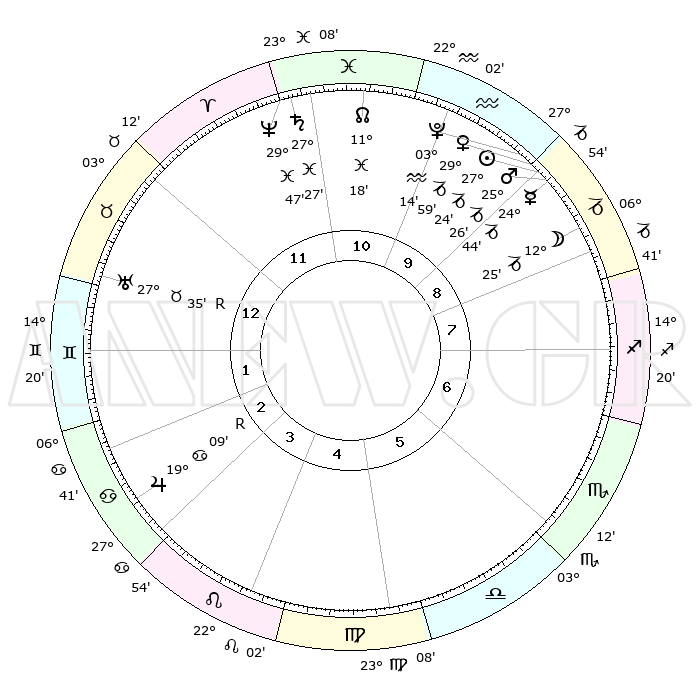 | | ΘΕΣΕΙΣ ΠΛΑΝΗΤΩΝ ΑΣΤΡΟΛΟΓΙΚΟΥ ΧΑΡΤΗ ΤΗΣ ΣΤΙΓΜΗΣ ΑΥΤΗΣ | | | | Πλανήτης | Ζώδιο | Μοίρες | Δεκαήμ. | Σε οίκο | Απόκλιση | | Ακμές των οίκων | | Ηλιος | Αιγόκερως | 27°19' | Τρίτο | 10 | 20 S 41 | | 1ος | 12°23' | Ταύρος | | Σελήνη | Αιγόκερως | 11°30' | Δεύτερο | 9 | 27 S 17 | | 2ος | 11°17' | Δίδυμοι | | Ερμής | Αιγόκερως | 24°37' | Τρίτο | 9 | 23 S 04 | | 3ος | 03°43' | Καρκίνος | | Αφροδίτη | Αιγόκερως | 29°54' | Τρίτο | 10 | 21 S 12 | | 4ος | 25°36' | Καρκίνος | | Αρης | Αιγόκερως | 25°23' | Τρίτο | 9 | 22 S 01 | | 5ος | 21°24' | Λέων | | Δίας | Καρκίνος | 19°09'R | Δεύτερο | 3 | 22 N 20 | | 6ος | 26°36' | Παρθένος | | Κρόνος | Ιχθείς | 27°26' | Τρίτο | 12 | 03 S 03 | | 7ος | 12°23' | Σκορπιός | | Ουρανός | Ταύρος | 27°35'R | Τρίτο | 1 | 19 N 26 | | 8ος | 11°17' | Τοξότης | | Ποσειδώνας | Ιχθείς | 29°47' | Τρίτο | 12 | 01 S 18 | | 9ος | 03°43' | Αιγόκερως | | Πλούτωνας | Υδροχόος | 03°14' | Πρώτο | 10 | 23 S 07 | | 10ος | 25°36' | Αιγόκερως | | Β. Δεσμός | Ιχθείς | 11°18' | Δεύτερο | 11 | 07 S 20 | | 11ος | 21°24' | Υδροχόος | | Ωροσκόπος | Ταύρος | 12°23' | Δεύτερο | | | 12ος | 26°36' | Ιχθείς | | Μεσουράνημα | Αιγόκερως | 25°36' | Τρίτο | | | |