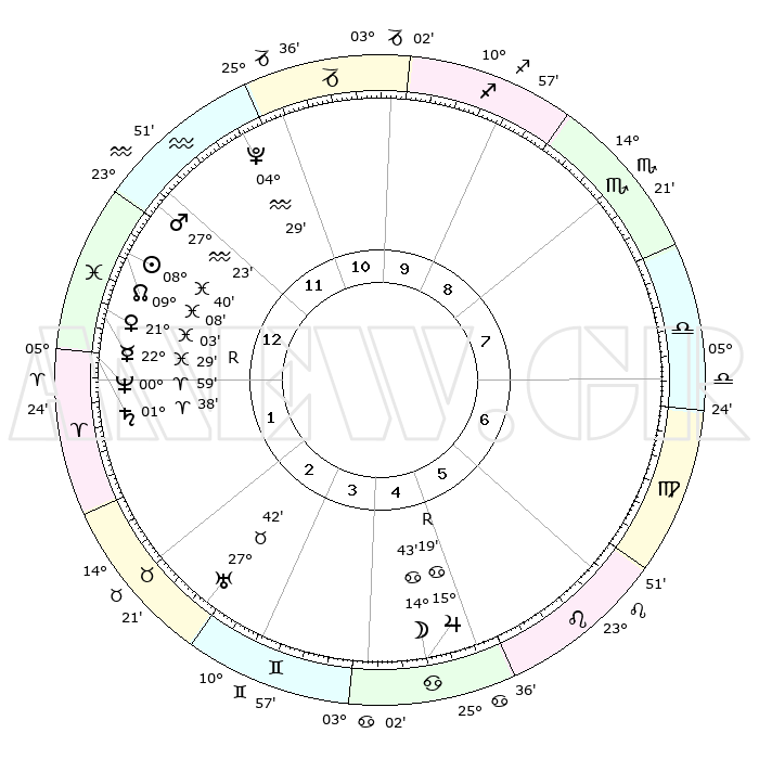 | | ΘΕΣΕΙΣ ΠΛΑΝΗΤΩΝ ΑΣΤΡΟΛΟΓΙΚΟΥ ΧΑΡΤΗ ΤΗΣ ΣΤΙΓΜΗΣ ΑΥΤΗΣ | | | | Πλανήτης | Ζώδιο | Μοίρες | Δεκαήμ. | Σε οίκο | Απόκλιση | | Ακμές των οίκων | | Ηλιος | Ιχθείς | 08°35' | Πρώτο | 1 | 08 S 21 | | 1ος | 24°44' | Υδροχόος | | Σελήνη | Καρκίνος | 13°43' | Δεύτερο | 5 | 27 N 03 | | 2ος | 10°28' | Κριός | | Ερμής | Ιχθείς | 22°30'R | Τρίτο | 1 | 00 S 15 | | 3ος | 14°14' | Ταύρος | | Αφροδίτη | Ιχθείς | 20°58' | Τρίτο | 1 | 04 S 51 | | 4ος | 09°11' | Δίδυμοι | | Αρης | Υδροχόος | 27°19' | Τρίτο | 1 | 13 S 26 | | 5ος | 00°55' | Καρκίνος | | Δίας | Καρκίνος | 15°19'R | Δεύτερο | 5 | 22 N 54 | | 6ος | 23°57' | Καρκίνος | | Κρόνος | Κριός | 01°37' | Πρώτο | 1 | 01 S 19 | | 7ος | 24°44' | Λέων | | Ουρανός | Ταύρος | 27°42' | Τρίτο | 3 | 19 N 28 | | 8ος | 10°28' | Ζυγός | | Ποσειδώνας | Κριός | 00°59' | Πρώτο | 1 | 00 S 48 | | 9ος | 14°14' | Σκορπιός | | Πλούτωνας | Υδροχόος | 04°29' | Πρώτο | 12 | 22 S 53 | | 10ος | 09°11' | Τοξότης | | Β. Δεσμός | Ιχθείς | 09°08' | Πρώτο | 1 | 08 S 08 | | 11ος | 00°55' | Αιγόκερως | | Ωροσκόπος | Υδροχόος | 24°44' | Τρίτο | | | 12ος | 23°57' | Αιγόκερως | | Μεσουράνημα | Τοξότης | 09°11' | Πρώτο | | | |