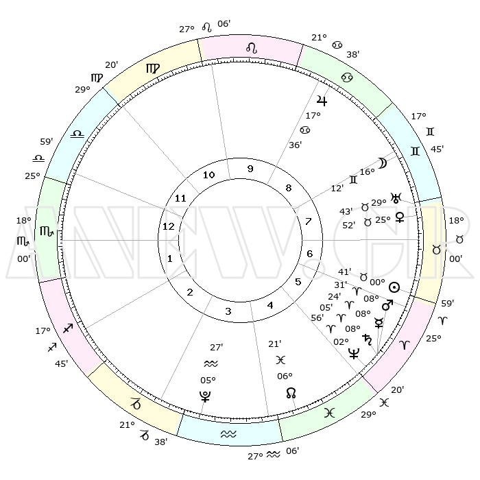 | | ΘΕΣΕΙΣ ΠΛΑΝΗΤΩΝ ΑΣΤΡΟΛΟΓΙΚΟΥ ΧΑΡΤΗ ΤΗΣ ΣΤΙΓΜΗΣ ΑΥΤΗΣ | | | | Πλανήτης | Ζώδιο | Μοίρες | Δεκαήμ. | Σε οίκο | Απόκλιση | | Ακμές των οίκων | | Ηλιος | Ταύρος | 00°38' | Πρώτο | 7 | 11 N 41 | | 1ος | 00°05' | Σκορπιός | | Σελήνη | Δίδυμοι | 15°17' | Δεύτερο | 8 | 27 N 39 | | 2ος | 28°30' | Σκορπιός | | Ερμής | Κριός | 08°18' | Πρώτο | 6 | 00 N 54 | | 3ος | 00°28' | Αιγόκερως | | Αφροδίτη | Ταύρος | 25°48' | Τρίτο | 7 | 19 N 37 | | 4ος | 04°40' | Υδροχόος | | Αρης | Κριός | 08°28' | Πρώτο | 6 | 02 N 29 | | 5ος | 07°35' | Ιχθείς | | Δίας | Καρκίνος | 17°36' | Δεύτερο | 9 | 22 N 39 | | 6ος | 06°15' | Κριός | | Κρόνος | Κριός | 08°04' | Πρώτο | 6 | 01 N 13 | | 7ος | 00°05' | Ταύρος | | Ουρανός | Ταύρος | 29°43' | Τρίτο | 8 | 19 N 55 | | 8ος | 28°30' | Ταύρος | | Ποσειδώνας | Κριός | 02°55' | Πρώτο | 5 | 00 S 03 | | 9ος | 00°28' | Καρκίνος | | Πλούτωνας | Υδροχόος | 05°27' | Πρώτο | 4 | 22 S 48 | | 10ος | 04°40' | Λέων | | Β. Δεσμός | Ιχθείς | 06°22' | Πρώτο | 4 | 09 S 11 | | 11ος | 07°35' | Παρθένος | | Ωροσκόπος | Σκορπιός | 00°05' | Πρώτο | | | 12ος | 06°15' | Ζυγός | | Μεσουράνημα | Λέων | 04°40' | Πρώτο | | | |