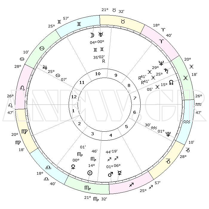 | | ΘΕΣΕΙΣ ΠΛΑΝΗΤΩΝ ΑΣΤΡΟΛΟΓΙΚΟΥ ΧΑΡΤΗ ΤΗΣ ΣΤΙΓΜΗΣ ΑΥΤΗΣ | | | | Πλανήτης | Ζώδιο | Μοίρες | Δεκαήμ. | Σε οίκο | Απόκλιση | | Ακμές των οίκων | | Ηλιος | Σκορπιός | 14°41' | Δεύτερο | 4 | 16 S 14 | | 1ος | 29°35' | Καρκίνος | | Σελήνη | Δίδυμοι | 03°09' | Πρώτο | 11 | 25 N 37 | | 2ος | 20°35' | Λέων | | Ερμής | Τοξότης | 06°16' | Πρώτο | 5 | 24 S 00 | | 3ος | 15°35' | Παρθένος | | Αφροδίτη | Ζυγός | 29°53' | Τρίτο | 4 | 10 S 08 | | 4ος | 16°34' | Ζυγός | | Αρης | Τοξότης | 01°40' | Πρώτο | 5 | 20 S 56 | | 5ος | 22°37' | Σκορπιός | | Δίας | Καρκίνος | 25°07' | Τρίτο | 12 | 21 N 12 | | 6ος | 28°23' | Τοξότης | | Κρόνος | Ιχθείς | 25°41'R | Τρίτο | 9 | 03 S 58 | | 7ος | 29°35' | Αιγόκερως | | Ουρανός | Δίδυμοι | 00°03'R | Πρώτο | 11 | 19 N 57 | | 8ος | 20°35' | Υδροχόος | | Ποσειδώνας | Ιχθείς | 29°41'R | Τρίτο | 9 | 01 S 23 | | 9ος | 15°35' | Ιχθείς | | Πλούτωνας | Υδροχόος | 01°30' | Πρώτο | 7 | 23 S 30 | | 10ος | 16°34' | Κριός | | Β. Δεσμός | Ιχθείς | 15°05' | Δεύτερο | 8 | 05 S 52 | | 11ος | 22°37' | Ταύρος | | Ωροσκόπος | Καρκίνος | 29°35' | Τρίτο | | | 12ος | 28°23' | Δίδυμοι | | Μεσουράνημα | Κριός | 16°34' | Δεύτερο | | | |