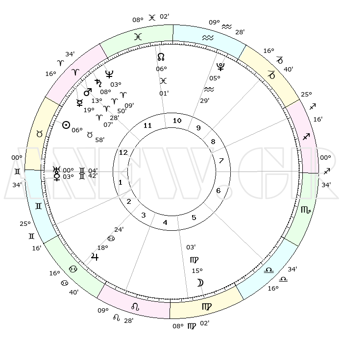 | | ΘΕΣΕΙΣ ΠΛΑΝΗΤΩΝ ΑΣΤΡΟΛΟΓΙΚΟΥ ΧΑΡΤΗ ΤΗΣ ΣΤΙΓΜΗΣ ΑΥΤΗΣ | | | | Πλανήτης | Ζώδιο | Μοίρες | Δεκαήμ. | Σε οίκο | Απόκλιση | | Ακμές των οίκων | | Ηλιος | Ταύρος | 06°54' | Πρώτο | 1 | 13 N 49 | | 1ος | 03°13' | Ταύρος | | Σελήνη | Παρθένος | 14°18' | Δεύτερο | 5 | 05 N 36 | | 2ος | 04°33' | Δίδυμοι | | Ερμής | Κριός | 19°00' | Δεύτερο | 12 | 05 N 20 | | 3ος | 27°47' | Δίδυμοι | | Αφροδίτη | Δίδυμοι | 03°38' | Πρώτο | 1 | 21 N 35 | | 4ος | 19°30' | Καρκίνος | | Αρης | Κριός | 13°26' | Δεύτερο | 12 | 04 N 27 | | 5ος | 14°13' | Λέων | | Δίας | Καρκίνος | 18°24' | Δεύτερο | 3 | 22 N 33 | | 6ος | 17°35' | Παρθένος | | Κρόνος | Κριός | 08°49' | Πρώτο | 12 | 01 N 30 | | 7ος | 03°13' | Σκορπιός | | Ουρανός | Δίδυμοι | 00°04' | Πρώτο | 1 | 20 N 00 | | 8ος | 04°33' | Τοξότης | | Ποσειδώνας | Κριός | 03°08' | Πρώτο | 12 | 00 N 02 | | 9ος | 27°47' | Τοξότης | | Πλούτωνας | Υδροχόος | 05°29' | Πρώτο | 10 | 22 S 48 | | 10ος | 19°30' | Αιγόκερως | | Β. Δεσμός | Ιχθείς | 06°01' | Πρώτο | 11 | 09 S 18 | | 11ος | 14°14' | Υδροχόος | | Ωροσκόπος | Ταύρος | 03°13' | Πρώτο | | | 12ος | 17°35' | Ιχθείς | | Μεσουράνημα | Αιγόκερως | 19°30' | Δεύτερο | | | |