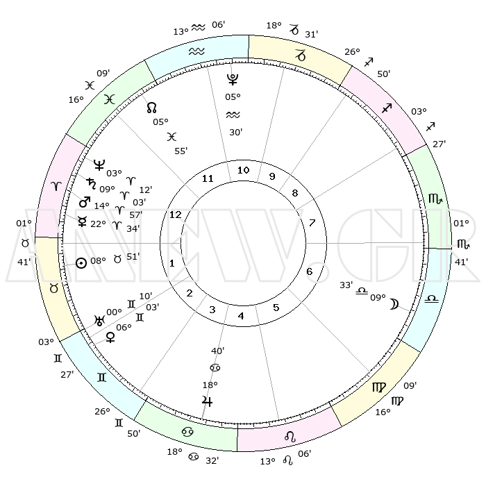 | | ΘΕΣΕΙΣ ΠΛΑΝΗΤΩΝ ΑΣΤΡΟΛΟΓΙΚΟΥ ΧΑΡΤΗ ΤΗΣ ΣΤΙΓΜΗΣ ΑΥΤΗΣ | | | | Πλανήτης | Ζώδιο | Μοίρες | Δεκαήμ. | Σε οίκο | Απόκλιση | | Ακμές των οίκων | | Ηλιος | Ταύρος | 08°44' | Πρώτο | 2 | 14 N 25 | | 1ος | 00°12' | Ιχθείς | | Σελήνη | Ζυγός | 08°12' | Πρώτο | 7 | 05 S 39 | | 2ος | 15°36' | Κριός | | Ερμής | Κριός | 22°22' | Τρίτο | 2 | 06 N 44 | | 3ος | 18°17' | Ταύρος | | Αφροδίτη | Δίδυμοι | 05°55' | Πρώτο | 3 | 22 N 05 | | 4ος | 12°40' | Δίδυμοι | | Αρης | Κριός | 14°52' | Δεύτερο | 1 | 05 N 02 | | 5ος | 04°21' | Καρκίνος | | Δίας | Καρκίνος | 18°39' | Δεύτερο | 5 | 22 N 31 | | 6ος | 27°55' | Καρκίνος | | Κρόνος | Κριός | 09°02' | Πρώτο | 1 | 01 N 35 | | 7ος | 00°12' | Παρθένος | | Ουρανός | Δίδυμοι | 00°10' | Πρώτο | 3 | 20 N 01 | | 8ος | 15°36' | Ζυγός | | Ποσειδώνας | Κριός | 03°12' | Πρώτο | 1 | 00 N 04 | | 9ος | 18°17' | Σκορπιός | | Πλούτωνας | Υδροχόος | 05°30' | Πρώτο | 12 | 22 S 49 | | 10ος | 12°40' | Τοξότης | | Β. Δεσμός | Ιχθείς | 05°55' | Πρώτο | 1 | 09 S 20 | | 11ος | 04°21' | Αιγόκερως | | Ωροσκόπος | Ιχθείς | 00°12' | Πρώτο | | | 12ος | 27°56' | Αιγόκερως | | Μεσουράνημα | Τοξότης | 12°40' | Δεύτερο | | | |