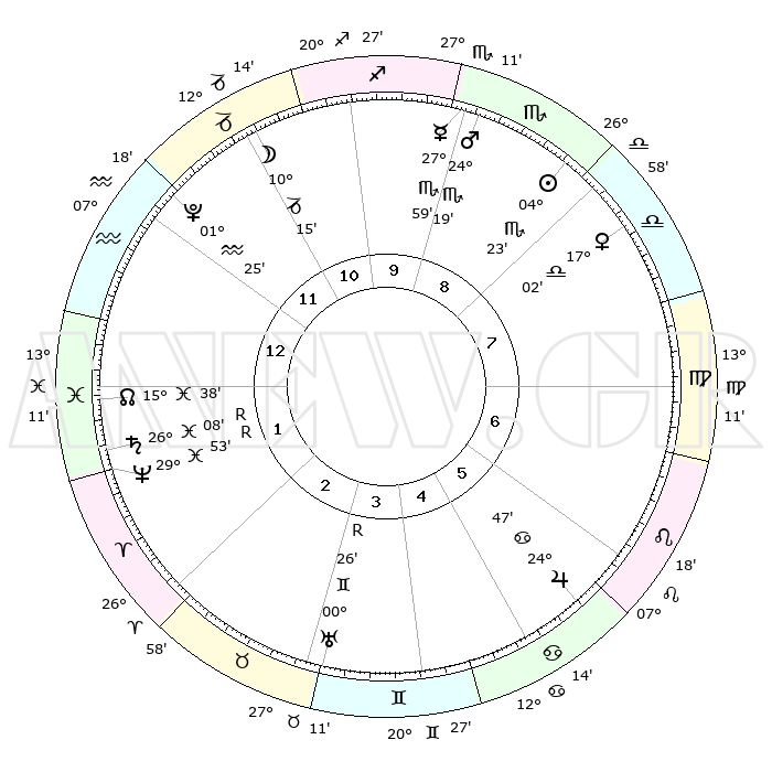 | | ΘΕΣΕΙΣ ΠΛΑΝΗΤΩΝ ΑΣΤΡΟΛΟΓΙΚΟΥ ΧΑΡΤΗ ΤΗΣ ΣΤΙΓΜΗΣ ΑΥΤΗΣ | | | | Πλανήτης | Ζώδιο | Μοίρες | Δεκαήμ. | Σε οίκο | Απόκλιση | | Ακμές των οίκων | | Ηλιος | Σκορπιός | 04°17' | Πρώτο | 9 | 12 S 57 | | 1ος | 27°02' | Αιγόκερως | | Σελήνη | Αιγόκερως | 09°08' | Πρώτο | 12 | 27 S 52 | | 2ος | 10°36' | Ιχθείς | | Ερμής | Σκορπιός | 27°53' | Τρίτο | 10 | 22 S 23 | | 3ος | 19°30' | Κριός | | Αφροδίτη | Ζυγός | 16°55' | Δεύτερο | 8 | 05 S 14 | | 4ος | 18°29' | Ταύρος | | Αρης | Σκορπιός | 24°15' | Τρίτο | 10 | 19 S 10 | | 5ος | 11°28' | Δίδυμοι | | Δίας | Καρκίνος | 24°46' | Τρίτο | 6 | 21 N 14 | | 6ος | 02°48' | Καρκίνος | | Κρόνος | Ιχθείς | 26°09'R | Τρίτο | 2 | 03 S 48 | | 7ος | 27°02' | Καρκίνος | | Ουρανός | Δίδυμοι | 00°26'R | Πρώτο | 4 | 20 N 02 | | 8ος | 10°36' | Παρθένος | | Ποσειδώνας | Ιχθείς | 29°53'R | Τρίτο | 2 | 01 S 18 | | 9ος | 19°30' | Ζυγός | | Πλούτωνας | Υδροχόος | 01°25' | Πρώτο | 1 | 23 S 31 | | 10ος | 18°29' | Σκορπιός | | Β. Δεσμός | Ιχθείς | 15°38' | Δεύτερο | 2 | 05 S 40 | | 11ος | 11°28' | Τοξότης | | Ωροσκόπος | Αιγόκερως | 27°02' | Τρίτο | | | 12ος | 02°48' | Αιγόκερως | | Μεσουράνημα | Σκορπιός | 18°29' | Δεύτερο | | | |
