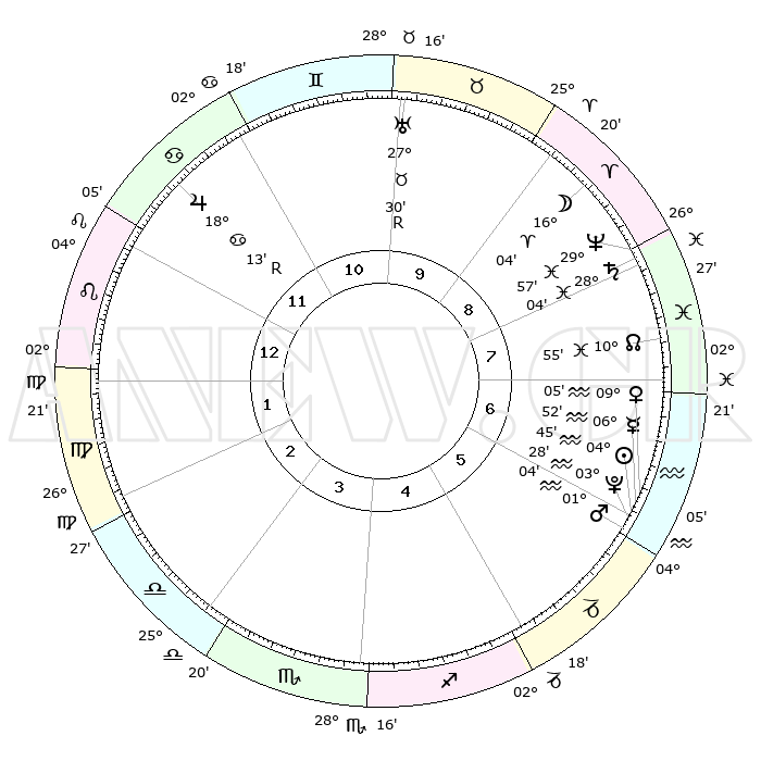 | | ΘΕΣΕΙΣ ΠΛΑΝΗΤΩΝ ΑΣΤΡΟΛΟΓΙΚΟΥ ΧΑΡΤΗ ΤΗΣ ΣΤΙΓΜΗΣ ΑΥΤΗΣ | | | | Πλανήτης | Ζώδιο | Μοίρες | Δεκαήμ. | Σε οίκο | Απόκλιση | | Ακμές των οίκων | | Ηλιος | Υδροχόος | 04°41' | Πρώτο | 6 | 19 S 05 | | 1ος | 10°12' | Λέων | | Σελήνη | Κριός | 15°01' | Δεύτερο | 9 | 08 N 43 | | 2ος | 02°03' | Παρθένος | | Ερμής | Υδροχόος | 06°44' | Πρώτο | 6 | 20 S 36 | | 3ος | 28°29' | Παρθένος | | Αφροδίτη | Υδροχόος | 08°59' | Πρώτο | 6 | 19 S 11 | | 4ος | 00°34' | Σκορπιός | | Αρης | Υδροχόος | 01°01' | Πρώτο | 6 | 20 S 55 | | 5ος | 06°09' | Τοξότης | | Δίας | Καρκίνος | 18°13'R | Δεύτερο | 12 | 22 N 29 | | 6ος | 10°17' | Αιγόκερως | | Κρόνος | Ιχθείς | 28°04' | Τρίτο | 8 | 02 S 47 | | 7ος | 10°12' | Υδροχόος | | Ουρανός | Ταύρος | 27°30'R | Τρίτο | 10 | 19 N 25 | | 8ος | 02°03' | Ιχθείς | | Ποσειδώνας | Ιχθείς | 29°57' | Τρίτο | 9 | 01 S 14 | | 9ος | 28°29' | Ιχθείς | | Πλούτωνας | Υδροχόος | 03°28' | Πρώτο | 6 | 23 S 04 | | 10ος | 00°34' | Ταύρος | | Β. Δεσμός | Ιχθείς | 10°55' | Δεύτερο | 8 | 07 S 28 | | 11ος | 06°09' | Δίδυμοι | | Ωροσκόπος | Λέων | 10°12' | Δεύτερο | | | 12ος | 10°17' | Καρκίνος | | Μεσουράνημα | Ταύρος | 00°34' | Πρώτο | | | |