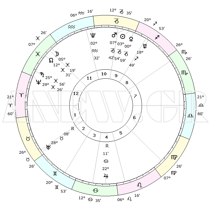 | | ΘΕΣΕΙΣ ΠΛΑΝΗΤΩΝ ΑΣΤΡΟΛΟΓΙΚΟΥ ΧΑΡΤΗ ΤΗΣ ΣΤΙΓΜΗΣ ΑΥΤΗΣ | | | | Πλανήτης | Ζώδιο | Μοίρες | Δεκαήμ. | Σε οίκο | Απόκλιση | | Ακμές των οίκων | | Ηλιος | Αιγόκερως | 03°50' | Πρώτο | 10 | 23 S 23 | | 1ος | 11°35' | Ιχθείς | | Σελήνη | Ιχθείς | 04°25' | Πρώτο | 12 | 10 S 27 | | 2ος | 25°38' | Κριός | | Ερμής | Τοξότης | 18°43' | Δεύτερο | 9 | 22 S 45 | | 3ος | 26°08' | Ταύρος | | Αφροδίτη | Αιγόκερως | 00°54' | Πρώτο | 10 | 23 S 41 | | 4ος | 19°32' | Δίδυμοι | | Αρης | Αιγόκερως | 07°39' | Πρώτο | 10 | 24 S 04 | | 5ος | 11°17' | Καρκίνος | | Δίας | Καρκίνος | 22°11'R | Τρίτο | 5 | 21 N 50 | | 6ος | 06°09' | Λέων | | Κρόνος | Ιχθείς | 25°56' | Τρίτο | 1 | 03 S 43 | | 7ος | 11°35' | Παρθένος | | Ουρανός | Ταύρος | 28°08'R | Τρίτο | 3 | 19 N 33 | | 8ος | 25°38' | Ζυγός | | Ποσειδώνας | Ιχθείς | 29°26' | Τρίτο | 1 | 01 S 27 | | 9ος | 26°08' | Σκορπιός | | Πλούτωνας | Υδροχόος | 02°32' | Πρώτο | 11 | 23 S 16 | | 10ος | 19°32' | Τοξότης | | Β. Δεσμός | Ιχθείς | 12°31' | Δεύτερο | 1 | 06 S 52 | | 11ος | 11°17' | Αιγόκερως | | Ωροσκόπος | Ιχθείς | 11°35' | Δεύτερο | | | 12ος | 06°09' | Υδροχόος | | Μεσουράνημα | Τοξότης | 19°32' | Δεύτερο | | | |