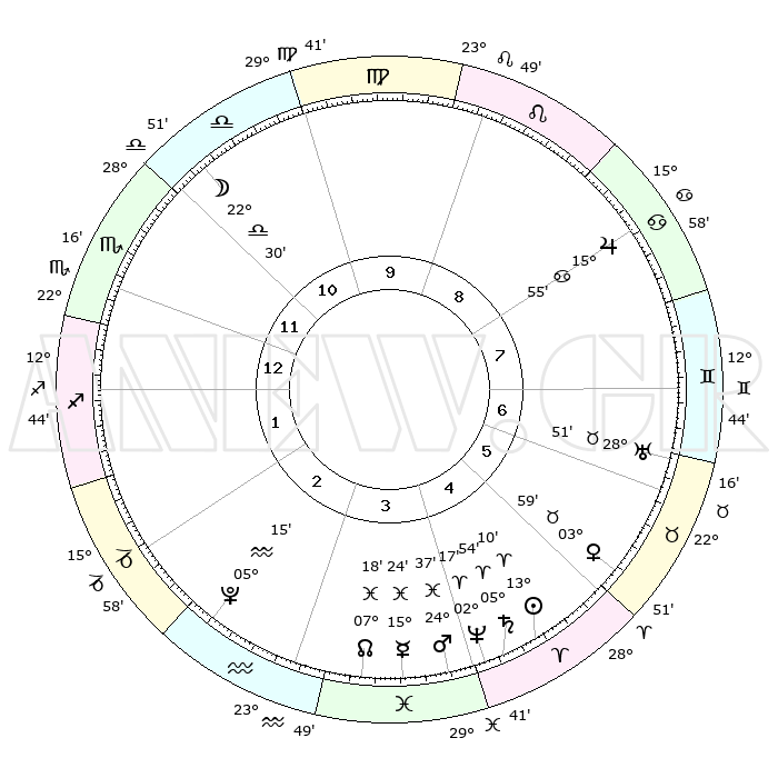| | ΘΕΣΕΙΣ ΠΛΑΝΗΤΩΝ ΑΣΤΡΟΛΟΓΙΚΟΥ ΧΑΡΤΗ ΤΗΣ ΣΤΙΓΜΗΣ ΑΥΤΗΣ | | | | Πλανήτης | Ζώδιο | Μοίρες | Δεκαήμ. | Σε οίκο | Απόκλιση | | Ακμές των οίκων | | Ηλιος | Κριός | 13°06' | Δεύτερο | 5 | 05 N 10 | | 1ος | 24°54' | Σκορπιός | | Σελήνη | Ζυγός | 21°45' | Τρίτο | 11 | 11 S 46 | | 2ος | 25°22' | Τοξότης | | Ερμής | Ιχθείς | 15°21' | Δεύτερο | 4 | 07 S 14 | | 3ος | 00°15' | Υδροχόος | | Αφροδίτη | Ταύρος | 03°55' | Πρώτο | 6 | 12 N 29 | | 4ος | 06°07' | Ιχθείς | | Αρης | Ιχθείς | 24°34' | Τρίτο | 4 | 03 S 07 | | 5ος | 07°44' | Κριός | | Δίας | Καρκίνος | 15°54' | Δεύτερο | 8 | 22 N 51 | | 6ος | 03°29' | Ταύρος | | Κρόνος | Κριός | 05°53' | Πρώτο | 4 | 00 N 23 | | 7ος | 24°54' | Ταύρος | | Ουρανός | Ταύρος | 28°51' | Τρίτο | 7 | 19 N 44 | | 8ος | 25°22' | Δίδυμοι | | Ποσειδώνας | Κριός | 02°17' | Πρώτο | 4 | 00 S 18 | | 9ος | 00°15' | Λέων | | Πλούτωνας | Υδροχόος | 05°15' | Πρώτο | 3 | 22 S 47 | | 10ος | 06°07' | Παρθένος | | Β. Δεσμός | Ιχθείς | 07°18' | Πρώτο | 4 | 08 S 50 | | 11ος | 07°44' | Ζυγός | | Ωροσκόπος | Σκορπιός | 24°54' | Τρίτο | | | 12ος | 03°29' | Σκορπιός | | Μεσουράνημα | Παρθένος | 06°07' | Πρώτο | | | |