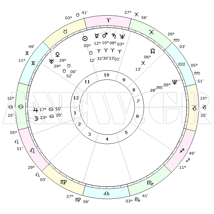| | ΘΕΣΕΙΣ ΠΛΑΝΗΤΩΝ ΑΣΤΡΟΛΟΓΙΚΟΥ ΧΑΡΤΗ ΤΗΣ ΣΤΙΓΜΗΣ ΑΥΤΗΣ | | | | Πλανήτης | Ζώδιο | Μοίρες | Δεκαήμ. | Σε οίκο | Απόκλιση | | Ακμές των οίκων | | Ηλιος | Ταύρος | 03°09' | Πρώτο | 11 | 12 N 33 | | 1ος | 26°19' | Δίδυμοι | | Σελήνη | Καρκίνος | 22°30' | Τρίτο | 2 | 25 N 07 | | 2ος | 17°21' | Καρκίνος | | Ερμής | Κριός | 12°26' | Δεύτερο | 11 | 02 N 35 | | 3ος | 08°57' | Λέων | | Αφροδίτη | Ταύρος | 28°56' | Τρίτο | 12 | 20 N 27 | | 4ος | 04°41' | Παρθένος | | Αρης | Κριός | 10°27' | Δεύτερο | 11 | 03 N 16 | | 5ος | 08°01' | Ζυγός | | Δίας | Καρκίνος | 17°54' | Δεύτερο | 2 | 22 N 37 | | 6ος | 18°13' | Σκορπιός | | Κρόνος | Κριός | 08°22' | Πρώτο | 11 | 01 N 20 | | 7ος | 26°19' | Τοξότης | | Ουρανός | Ταύρος | 29°51' | Τρίτο | 12 | 19 N 57 | | 8ος | 17°21' | Αιγόκερως | | Ποσειδώνας | Κριός | 03°01' | Πρώτο | 10 | 00 S 01 | | 9ος | 08°57' | Υδροχόος | | Πλούτωνας | Υδροχόος | 05°28' | Πρώτο | 8 | 22 S 48 | | 10ος | 04°41' | Ιχθείς | | Β. Δεσμός | Ιχθείς | 06°13' | Πρώτο | 10 | 09 S 14 | | 11ος | 08°01' | Κριός | | Ωροσκόπος | Δίδυμοι | 26°19' | Τρίτο | | | 12ος | 18°13' | Ταύρος | | Μεσουράνημα | Ιχθείς | 04°41' | Πρώτο | | | |