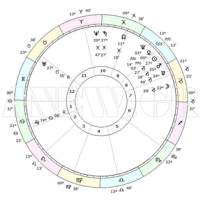 | | ΘΕΣΕΙΣ ΠΛΑΝΗΤΩΝ ΑΣΤΡΟΛΟΓΙΚΟΥ ΧΑΡΤΗ ΤΗΣ ΣΤΙΓΜΗΣ ΑΥΤΗΣ | | | | Πλανήτης | Ζώδιο | Μοίρες | Δεκαήμ. | Σε οίκο | Απόκλιση | | Ακμές των οίκων | | Ηλιος | Αιγόκερως | 27°22' | Τρίτο | 9 | 20 S 41 | | 1ος | 01°24' | Δίδυμοι | | Σελήνη | Αιγόκερως | 12°01' | Δεύτερο | 8 | 27 S 13 | | 2ος | 25°56' | Δίδυμοι | | Ερμής | Αιγόκερως | 24°41' | Τρίτο | 9 | 23 S 04 | | 3ος | 17°18' | Καρκίνος | | Αφροδίτη | Αιγόκερως | 29°57' | Τρίτο | 9 | 21 S 11 | | 4ος | 10°10' | Λέων | | Αρης | Αιγόκερως | 25°25' | Τρίτο | 9 | 22 S 01 | | 5ος | 08°52' | Παρθένος | | Δίας | Καρκίνος | 19°09'R | Δεύτερο | 3 | 22 N 20 | | 6ος | 17°32' | Ζυγός | | Κρόνος | Ιχθείς | 27°27' | Τρίτο | 11 | 03 S 03 | | 7ος | 01°24' | Τοξότης | | Ουρανός | Ταύρος | 27°35'R | Τρίτο | 12 | 19 N 26 | | 8ος | 25°56' | Τοξότης | | Ποσειδώνας | Ιχθείς | 29°47' | Τρίτο | 11 | 01 S 18 | | 9ος | 17°18' | Αιγόκερως | | Πλούτωνας | Υδροχόος | 03°14' | Πρώτο | 9 | 23 S 07 | | 10ος | 10°10' | Υδροχόος | | Β. Δεσμός | Ιχθείς | 11°18' | Δεύτερο | 11 | 07 S 20 | | 11ος | 08°52' | Ιχθείς | | Ωροσκόπος | Δίδυμοι | 01°24' | Πρώτο | | | 12ος | 17°32' | Κριός | | Μεσουράνημα | Υδροχόος | 10°10' | Δεύτερο | | | |