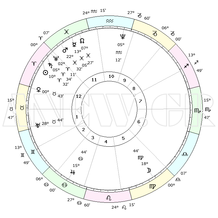 | | ΘΕΣΕΙΣ ΠΛΑΝΗΤΩΝ ΑΣΤΡΟΛΟΓΙΚΟΥ ΧΑΡΤΗ ΤΗΣ ΣΤΙΓΜΗΣ ΑΥΤΗΣ | | | | Πλανήτης | Ζώδιο | Μοίρες | Δεκαήμ. | Σε οίκο | Απόκλιση | | Ακμές των οίκων | | Ηλιος | Κριός | 10°29' | Δεύτερο | 12 | 04 N 09 | | 1ος | 14°15' | Κριός | | Σελήνη | Παρθένος | 17°58' | Δεύτερο | 6 | 03 N 59 | | 2ος | 20°51' | Ταύρος | | Ερμής | Ιχθείς | 13°02' | Δεύτερο | 12 | 07 S 45 | | 3ος | 16°14' | Δίδυμοι | | Αφροδίτη | Ταύρος | 00°39' | Πρώτο | 1 | 11 N 15 | | 4ος | 08°04' | Καρκίνος | | Αρης | Ιχθείς | 22°29' | Τρίτο | 12 | 03 S 56 | | 5ος | 01°10' | Λέων | | Δίας | Καρκίνος | 15°44' | Δεύτερο | 4 | 22 N 52 | | 6ος | 00°55' | Παρθένος | | Κρόνος | Κριός | 05°34' | Πρώτο | 12 | 00 N 15 | | 7ος | 14°15' | Ζυγός | | Ουρανός | Ταύρος | 28°44' | Τρίτο | 2 | 19 N 42 | | 8ος | 20°51' | Σκορπιός | | Ποσειδώνας | Κριός | 02°11' | Πρώτο | 12 | 00 S 20 | | 9ος | 16°14' | Τοξότης | | Πλούτωνας | Υδροχόος | 05°12' | Πρώτο | 11 | 22 S 47 | | 10ος | 08°04' | Αιγόκερως | | Β. Δεσμός | Ιχθείς | 07°27' | Πρώτο | 12 | 08 S 46 | | 11ος | 01°10' | Υδροχόος | | Ωροσκόπος | Κριός | 14°15' | Δεύτερο | | | 12ος | 00°55' | Ιχθείς | | Μεσουράνημα | Αιγόκερως | 08°04' | Πρώτο | | | |