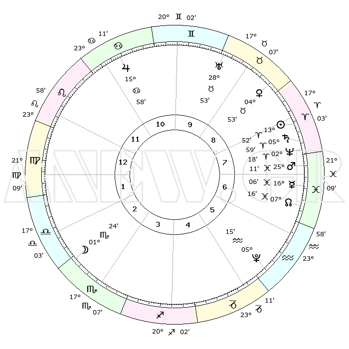 | | ΘΕΣΕΙΣ ΠΛΑΝΗΤΩΝ ΑΣΤΡΟΛΟΓΙΚΟΥ ΧΑΡΤΗ ΤΗΣ ΣΤΙΓΜΗΣ ΑΥΤΗΣ | | | | Πλανήτης | Ζώδιο | Μοίρες | Δεκαήμ. | Σε οίκο | Απόκλιση | | Ακμές των οίκων | | Ηλιος | Κριός | 14°06' | Δεύτερο | 4 | 05 N 34 | | 1ος | 01°46' | Τοξότης | | Σελήνη | Σκορπιός | 04°23' | Πρώτο | 11 | 17 S 00 | | 2ος | 03°09' | Αιγόκερως | | Ερμής | Ιχθείς | 16°20' | Δεύτερο | 4 | 06 S 58 | | 3ος | 09°09' | Υδροχόος | | Αφροδίτη | Ταύρος | 05°10' | Πρώτο | 5 | 12 N 56 | | 4ος | 15°14' | Ιχθείς | | Αρης | Ιχθείς | 25°22' | Τρίτο | 4 | 02 S 47 | | 5ος | 16°02' | Κριός | | Δίας | Καρκίνος | 15°59' | Δεύτερο | 8 | 22 N 51 | | 6ος | 10°51' | Ταύρος | | Κρόνος | Κριός | 06°01' | Πρώτο | 4 | 00 N 26 | | 7ος | 01°46' | Δίδυμοι | | Ουρανός | Ταύρος | 28°53' | Τρίτο | 6 | 19 N 44 | | 8ος | 03°09' | Καρκίνος | | Ποσειδώνας | Κριός | 02°19' | Πρώτο | 4 | 00 S 17 | | 9ος | 09°09' | Λέων | | Πλούτωνας | Υδροχόος | 05°16' | Πρώτο | 2 | 22 S 47 | | 10ος | 15°14' | Παρθένος | | Β. Δεσμός | Ιχθείς | 07°15' | Πρώτο | 3 | 08 S 51 | | 11ος | 16°02' | Ζυγός | | Ωροσκόπος | Τοξότης | 01°46' | Πρώτο | | | 12ος | 10°51' | Σκορπιός | | Μεσουράνημα | Παρθένος | 15°14' | Δεύτερο | | | |