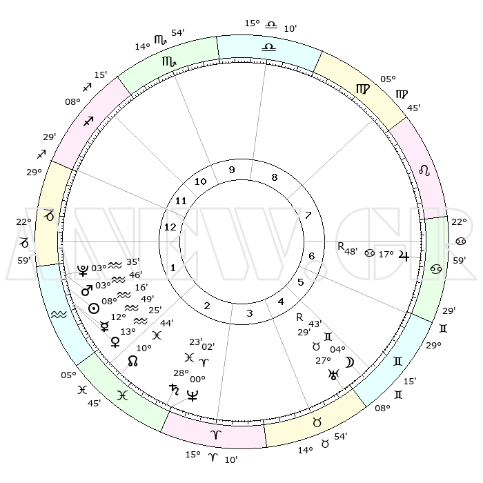 | | ΘΕΣΕΙΣ ΠΛΑΝΗΤΩΝ ΑΣΤΡΟΛΟΓΙΚΟΥ ΧΑΡΤΗ ΤΗΣ ΣΤΙΓΜΗΣ ΑΥΤΗΣ | | | | Πλανήτης | Ζώδιο | Μοίρες | Δεκαήμ. | Σε οίκο | Απόκλιση | | Ακμές των οίκων | | Ηλιος | Υδροχόος | 08°12' | Πρώτο | 1 | 18 S 13 | | 1ος | 01°30' | Αιγόκερως | | Σελήνη | Δίδυμοι | 03°51' | Πρώτο | 5 | 26 N 00 | | 2ος | 09°02' | Υδροχόος | | Ερμής | Υδροχόος | 12°43' | Δεύτερο | 2 | 18 S 57 | | 3ος | 19°08' | Ιχθείς | | Αφροδίτη | Υδροχόος | 13°21' | Δεύτερο | 2 | 18 S 03 | | 4ος | 22°50' | Κριός | | Αρης | Υδροχόος | 03°43' | Πρώτο | 1 | 20 S 19 | | 5ος | 18°55' | Ταύρος | | Δίας | Καρκίνος | 17°48'R | Δεύτερο | 7 | 22 N 33 | | 6ος | 10°37' | Δίδυμοι | | Κρόνος | Ιχθείς | 28°23' | Τρίτο | 3 | 02 S 39 | | 7ος | 01°30' | Καρκίνος | | Ουρανός | Ταύρος | 27°29'R | Τρίτο | 5 | 19 N 24 | | 8ος | 09°02' | Λέων | | Ποσειδώνας | Κριός | 00°02' | Πρώτο | 3 | 01 S 12 | | 9ος | 19°08' | Παρθένος | | Πλούτωνας | Υδροχόος | 03°35' | Πρώτο | 1 | 23 S 03 | | 10ος | 22°50' | Ζυγός | | Β. Δεσμός | Ιχθείς | 10°44' | Δεύτερο | 2 | 07 S 32 | | 11ος | 18°55' | Σκορπιός | | Ωροσκόπος | Αιγόκερως | 01°30' | Πρώτο | | | 12ος | 10°37' | Τοξότης | | Μεσουράνημα | Ζυγός | 22°50' | Τρίτο | | | |