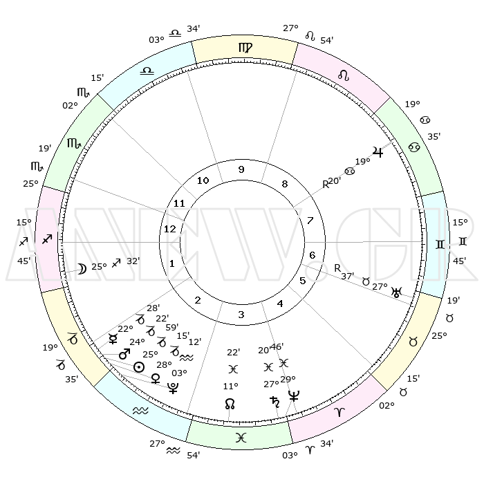 | | ΘΕΣΕΙΣ ΠΛΑΝΗΤΩΝ ΑΣΤΡΟΛΟΓΙΚΟΥ ΧΑΡΤΗ ΤΗΣ ΣΤΙΓΜΗΣ ΑΥΤΗΣ | | | | Πλανήτης | Ζώδιο | Μοίρες | Δεκαήμ. | Σε οίκο | Απόκλιση | | Ακμές των οίκων | | Ηλιος | Αιγόκερως | 25°55' | Τρίτο | 2 | 20 S 57 | | 1ος | 26°34' | Σκορπιός | | Σελήνη | Τοξότης | 24°46' | Τρίτο | 1 | 28 S 17 | | 2ος | 27°14' | Τοξότης | | Ερμής | Αιγόκερως | 22°22' | Τρίτο | 2 | 23 S 24 | | 3ος | 02°23' | Υδροχόος | | Αφροδίτη | Αιγόκερως | 28°10' | Τρίτο | 2 | 21 S 31 | | 4ος | 08°19' | Ιχθείς | | Αρης | Αιγόκερως | 24°19' | Τρίτο | 2 | 22 S 13 | | 5ος | 09°46' | Κριός | | Δίας | Καρκίνος | 19°20'R | Δεύτερο | 8 | 22 N 19 | | 6ος | 05°17' | Ταύρος | | Κρόνος | Ιχθείς | 27°20' | Τρίτο | 4 | 03 S 06 | | 7ος | 26°34' | Ταύρος | | Ουρανός | Ταύρος | 27°37'R | Τρίτο | 7 | 19 N 26 | | 8ος | 27°14' | Δίδυμοι | | Ποσειδώνας | Ιχθείς | 29°45' | Τρίτο | 4 | 01 S 19 | | 9ος | 02°23' | Λέων | | Πλούτωνας | Υδροχόος | 03°12' | Πρώτο | 3 | 23 S 07 | | 10ος | 08°19' | Παρθένος | | Β. Δεσμός | Ιχθείς | 11°22' | Δεύτερο | 4 | 07 S 18 | | 11ος | 09°46' | Ζυγός | | Ωροσκόπος | Σκορπιός | 26°34' | Τρίτο | | | 12ος | 05°17' | Σκορπιός | | Μεσουράνημα | Παρθένος | 08°19' | Πρώτο | | | |