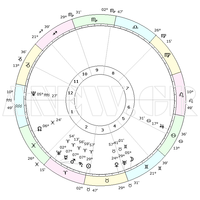 | | ΘΕΣΕΙΣ ΠΛΑΝΗΤΩΝ ΑΣΤΡΟΛΟΓΙΚΟΥ ΧΑΡΤΗ ΤΗΣ ΣΤΙΓΜΗΣ ΑΥΤΗΣ | | | | Πλανήτης | Ζώδιο | Μοίρες | Δεκαήμ. | Σε οίκο | Απόκλιση | | Ακμές των οίκων | | Ηλιος | Ταύρος | 00°11' | Πρώτο | 11 | 11 N 32 | | 1ος | 13°59' | Δίδυμοι | | Σελήνη | Δίδυμοι | 08°35' | Πρώτο | 12 | 26 N 46 | | 2ος | 06°23' | Καρκίνος | | Ερμής | Κριός | 07°36' | Πρώτο | 11 | 00 N 37 | | 3ος | 27°36' | Καρκίνος | | Αφροδίτη | Ταύρος | 25°15' | Τρίτο | 12 | 19 N 28 | | 4ος | 21°41' | Λέων | | Αρης | Κριός | 08°07' | Πρώτο | 11 | 02 N 20 | | 5ος | 22°43' | Παρθένος | | Δίας | Καρκίνος | 17°33' | Δεύτερο | 2 | 22 N 40 | | 6ος | 02°47' | Σκορπιός | | Κρόνος | Κριός | 08°01' | Πρώτο | 11 | 01 N 12 | | 7ος | 13°59' | Τοξότης | | Ουρανός | Ταύρος | 29°42' | Τρίτο | 12 | 19 N 55 | | 8ος | 06°23' | Αιγόκερως | | Ποσειδώνας | Κριός | 02°54' | Πρώτο | 11 | 00 S 03 | | 9ος | 27°36' | Αιγόκερως | | Πλούτωνας | Υδροχόος | 05°27' | Πρώτο | 9 | 22 S 48 | | 10ος | 21°41' | Υδροχόος | | Β. Δεσμός | Ιχθείς | 06°23' | Πρώτο | 10 | 09 S 10 | | 11ος | 22°43' | Ιχθείς | | Ωροσκόπος | Δίδυμοι | 13°59' | Δεύτερο | | | 12ος | 02°46' | Ταύρος | | Μεσουράνημα | Υδροχόος | 21°41' | Τρίτο | | | |