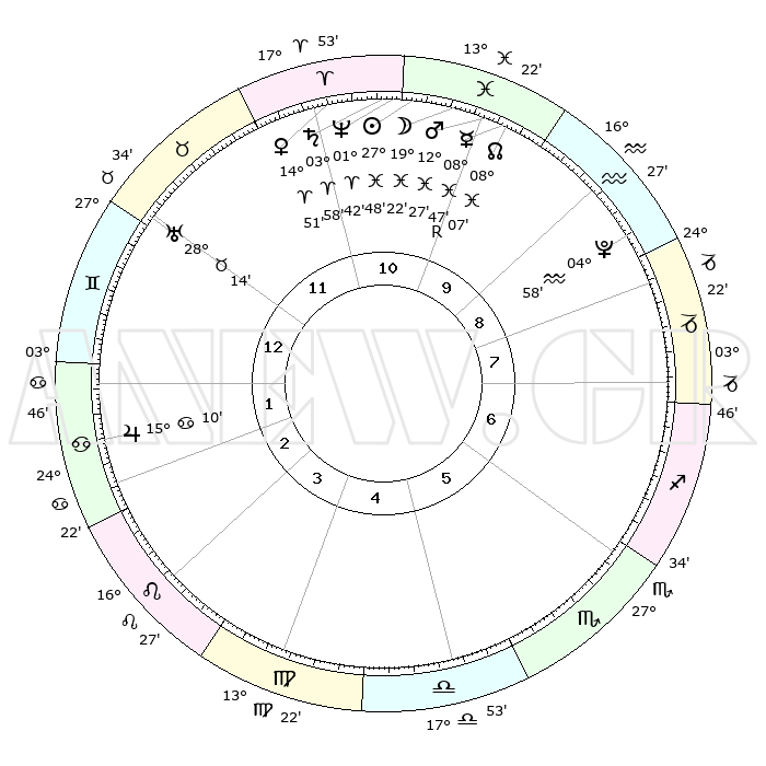 | | ΘΕΣΕΙΣ ΠΛΑΝΗΤΩΝ ΑΣΤΡΟΛΟΓΙΚΟΥ ΧΑΡΤΗ ΤΗΣ ΣΤΙΓΜΗΣ ΑΥΤΗΣ | | | | Πλανήτης | Ζώδιο | Μοίρες | Δεκαήμ. | Σε οίκο | Απόκλιση | | Ακμές των οίκων | | Ηλιος | Ιχθείς | 27°44' | Τρίτο | 11 | 00 S 54 | | 1ος | 06°30' | Δίδυμοι | | Σελήνη | Ιχθείς | 18°19' | Δεύτερο | 11 | 03 S 50 | | 2ος | 00°05' | Καρκίνος | | Ερμής | Ιχθείς | 08°48'R | Πρώτο | 10 | 06 S 47 | | 3ος | 21°20' | Καρκίνος | | Αφροδίτη | Κριός | 14°46' | Δεύτερο | 11 | 04 N 57 | | 4ος | 14°38' | Λέων | | Αρης | Ιχθείς | 12°24' | Δεύτερο | 10 | 07 S 54 | | 5ος | 14°16' | Παρθένος | | Δίας | Καρκίνος | 15°10' | Δεύτερο | 2 | 22 N 56 | | 6ος | 23°37' | Ζυγός | | Κρόνος | Κριός | 03°57' | Πρώτο | 11 | 00 S 23 | | 7ος | 06°30' | Τοξότης | | Ουρανός | Ταύρος | 28°14' | Τρίτο | 12 | 19 N 35 | | 8ος | 00°05' | Αιγόκερως | | Ποσειδώνας | Κριός | 01°42' | Πρώτο | 11 | 00 S 32 | | 9ος | 21°20' | Αιγόκερως | | Πλούτωνας | Υδροχόος | 04°58' | Πρώτο | 9 | 22 S 49 | | 10ος | 14°38' | Υδροχόος | | Β. Δεσμός | Ιχθείς | 08°08' | Πρώτο | 10 | 08 S 31 | | 11ος | 14°16' | Ιχθείς | | Ωροσκόπος | Δίδυμοι | 06°30' | Πρώτο | | | 12ος | 23°37' | Κριός | | Μεσουράνημα | Υδροχόος | 14°38' | Δεύτερο | | | |