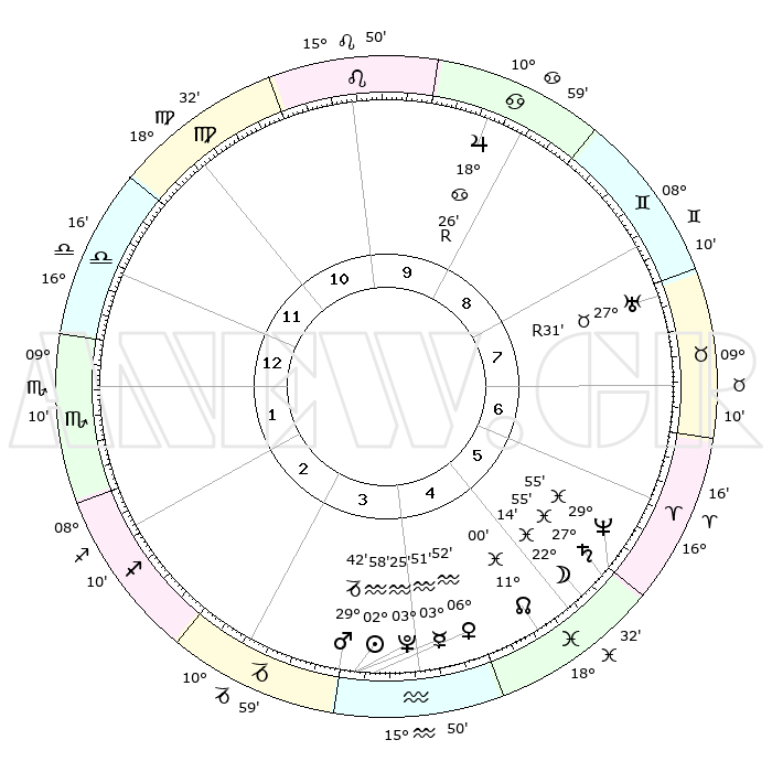 | | ΘΕΣΕΙΣ ΠΛΑΝΗΤΩΝ ΑΣΤΡΟΛΟΓΙΚΟΥ ΧΑΡΤΗ ΤΗΣ ΣΤΙΓΜΗΣ ΑΥΤΗΣ | | | | Πλανήτης | Ζώδιο | Μοίρες | Δεκαήμ. | Σε οίκο | Απόκλιση | | Ακμές των οίκων | | Ηλιος | Υδροχόος | 02°53' | Πρώτο | 4 | 19 S 31 | | 1ος | 17°18' | Ζυγός | | Σελήνη | Ιχθείς | 21°15' | Τρίτο | 5 | 02 S 29 | | 2ος | 14°59' | Σκορπιός | | Ερμής | Υδροχόος | 03°44' | Πρώτο | 4 | 21 S 20 | | 3ος | 16°08' | Τοξότης | | Αφροδίτη | Υδροχόος | 06°46' | Πρώτο | 4 | 19 S 44 | | 4ος | 19°36' | Αιγόκερως | | Αρης | Αιγόκερως | 29°38' | Τρίτο | 4 | 21 S 12 | | 5ος | 22°33' | Υδροχόος | | Δίας | Καρκίνος | 18°27'R | Δεύτερο | 9 | 22 N 27 | | 6ος | 22°10' | Ιχθείς | | Κρόνος | Ιχθείς | 27°54' | Τρίτο | 6 | 02 S 51 | | 7ος | 17°18' | Κριός | | Ουρανός | Ταύρος | 27°31'R | Τρίτο | 8 | 19 N 25 | | 8ος | 14°59' | Ταύρος | | Ποσειδώνας | Ιχθείς | 29°55' | Τρίτο | 6 | 01 S 15 | | 9ος | 16°08' | Δίδυμοι | | Πλούτωνας | Υδροχόος | 03°25' | Πρώτο | 4 | 23 S 05 | | 10ος | 19°36' | Καρκίνος | | Β. Δεσμός | Ιχθείς | 11°01' | Δεύτερο | 5 | 07 S 26 | | 11ος | 22°33' | Λέων | | Ωροσκόπος | Ζυγός | 17°18' | Δεύτερο | | | 12ος | 22°10' | Παρθένος | | Μεσουράνημα | Καρκίνος | 19°36' | Δεύτερο | | | |