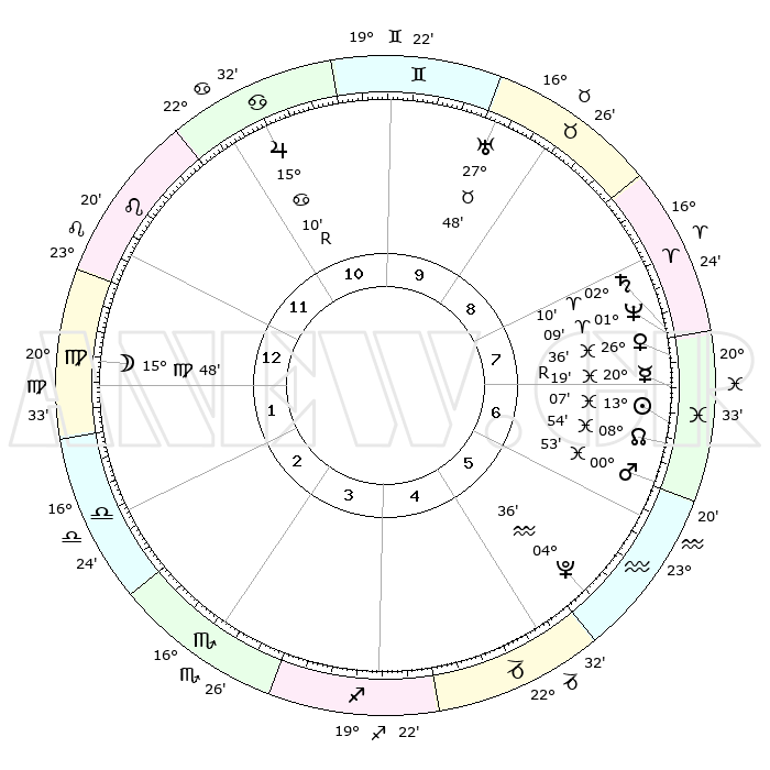 | | ΘΕΣΕΙΣ ΠΛΑΝΗΤΩΝ ΑΣΤΡΟΛΟΓΙΚΟΥ ΧΑΡΤΗ ΤΗΣ ΣΤΙΓΜΗΣ ΑΥΤΗΣ | | | | Πλανήτης | Ζώδιο | Μοίρες | Δεκαήμ. | Σε οίκο | Απόκλιση | | Ακμές των οίκων | | Ηλιος | Ιχθείς | 13°04' | Δεύτερο | 7 | 06 S 39 | | 1ος | 04°04' | Παρθένος | | Σελήνη | Παρθένος | 15°03' | Δεύτερο | 1 | 05 N 22 | | 2ος | 28°20' | Παρθένος | | Ερμής | Ιχθείς | 20°22'R | Τρίτο | 7 | 00 S 30 | | 3ος | 27°21' | Ζυγός | | Αφροδίτη | Ιχθείς | 26°31' | Τρίτο | 7 | 02 S 35 | | 4ος | 00°18' | Τοξότης | | Αρης | Ιχθείς | 00°50' | Πρώτο | 6 | 12 S 12 | | 5ος | 04°14' | Αιγόκερως | | Δίας | Καρκίνος | 15°11'R | Δεύτερο | 11 | 22 N 55 | | 6ος | 05°53' | Υδροχόος | | Κρόνος | Κριός | 02°09' | Πρώτο | 8 | 01 S 06 | | 7ος | 04°04' | Ιχθείς | | Ουρανός | Ταύρος | 27°48' | Τρίτο | 9 | 19 N 29 | | 8ος | 28°20' | Ιχθείς | | Ποσειδώνας | Κριός | 01°09' | Πρώτο | 8 | 00 S 45 | | 9ος | 27°21' | Κριός | | Πλούτωνας | Υδροχόος | 04°36' | Πρώτο | 5 | 22 S 52 | | 10ος | 00°18' | Δίδυμοι | | Β. Δεσμός | Ιχθείς | 08°54' | Πρώτο | 7 | 08 S 14 | | 11ος | 04°14' | Καρκίνος | | Ωροσκόπος | Παρθένος | 04°04' | Πρώτο | | | 12ος | 05°53' | Λέων | | Μεσουράνημα | Δίδυμοι | 00°18' | Πρώτο | | | |