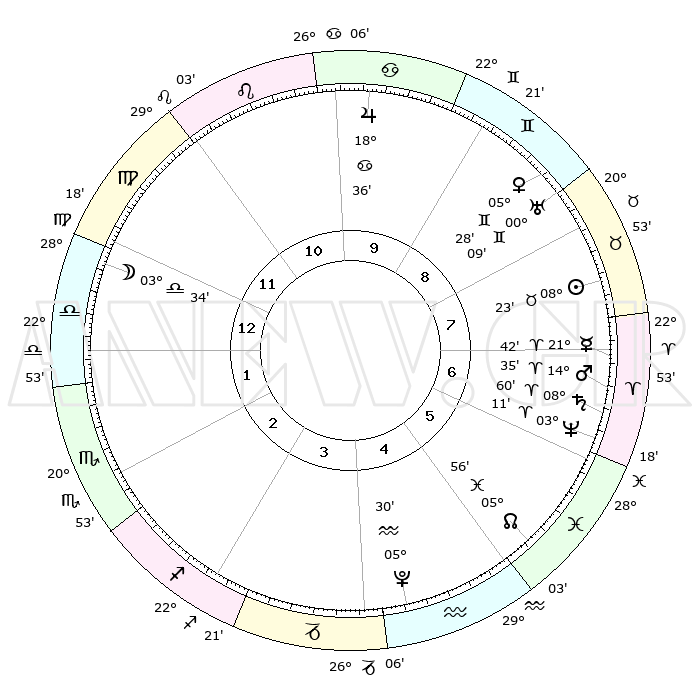 | | ΘΕΣΕΙΣ ΠΛΑΝΗΤΩΝ ΑΣΤΡΟΛΟΓΙΚΟΥ ΧΑΡΤΗ ΤΗΣ ΣΤΙΓΜΗΣ ΑΥΤΗΣ | | | | Πλανήτης | Ζώδιο | Μοίρες | Δεκαήμ. | Σε οίκο | Απόκλιση | | Ακμές των οίκων | | Ηλιος | Ταύρος | 08°20' | Πρώτο | 8 | 14 N 17 | | 1ος | 07°23' | Ζυγός | | Σελήνη | Ζυγός | 02°55' | Πρώτο | 12 | 03 S 11 | | 2ος | 04°29' | Σκορπιός | | Ερμής | Κριός | 21°36' | Τρίτο | 7 | 06 N 25 | | 3ος | 05°12' | Τοξότης | | Αφροδίτη | Δίδυμοι | 05°24' | Πρώτο | 9 | 21 N 59 | | 4ος | 08°18' | Αιγόκερως | | Αρης | Κριός | 14°33' | Δεύτερο | 7 | 04 N 54 | | 5ος | 11°14' | Υδροχόος | | Δίας | Καρκίνος | 18°35' | Δεύτερο | 10 | 22 N 32 | | 6ος | 11°22' | Ιχθείς | | Κρόνος | Κριός | 08°59' | Πρώτο | 7 | 01 N 34 | | 7ος | 07°23' | Κριός | | Ουρανός | Δίδυμοι | 00°09' | Πρώτο | 8 | 20 N 01 | | 8ος | 04°29' | Ταύρος | | Ποσειδώνας | Κριός | 03°11' | Πρώτο | 6 | 00 N 03 | | 9ος | 05°12' | Δίδυμοι | | Πλούτωνας | Υδροχόος | 05°30' | Πρώτο | 4 | 22 S 48 | | 10ος | 08°18' | Καρκίνος | | Β. Δεσμός | Ιχθείς | 05°56' | Πρώτο | 5 | 09 S 20 | | 11ος | 11°14' | Λέων | | Ωροσκόπος | Ζυγός | 07°23' | Πρώτο | | | 12ος | 11°22' | Παρθένος | | Μεσουράνημα | Καρκίνος | 08°18' | Πρώτο | | | |
