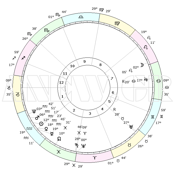 | | ΘΕΣΕΙΣ ΠΛΑΝΗΤΩΝ ΑΣΤΡΟΛΟΓΙΚΟΥ ΧΑΡΤΗ ΤΗΣ ΣΤΙΓΜΗΣ ΑΥΤΗΣ | | | | Πλανήτης | Ζώδιο | Μοίρες | Δεκαήμ. | Σε οίκο | Απόκλιση | | Ακμές των οίκων | | Ηλιος | Υδροχόος | 12°01' | Δεύτερο | 4 | 17 S 11 | | 1ος | 20°14' | Ζυγός | | Σελήνη | Καρκίνος | 28°19' | Τρίτο | 10 | 23 N 50 | | 2ος | 18°05' | Σκορπιός | | Ερμής | Υδροχόος | 19°17' | Δεύτερο | 4 | 16 S 50 | | 3ος | 19°23' | Τοξότης | | Αφροδίτη | Υδροχόος | 18°03' | Δεύτερο | 4 | 16 S 43 | | 4ος | 22°59' | Αιγόκερως | | Αρης | Υδροχόος | 06°39' | Πρώτο | 4 | 19 S 37 | | 5ος | 25°57' | Υδροχόος | | Δίας | Καρκίνος | 17°22'R | Δεύτερο | 9 | 22 N 36 | | 6ος | 25°23' | Ιχθείς | | Κρόνος | Ιχθείς | 28°45' | Τρίτο | 6 | 02 S 30 | | 7ος | 20°14' | Κριός | | Ουρανός | Ταύρος | 27°28'R | Τρίτο | 8 | 19 N 24 | | 8ος | 18°05' | Ταύρος | | Ποσειδώνας | Κριός | 00°08' | Πρώτο | 6 | 01 S 09 | | 9ος | 19°23' | Δίδυμοι | | Πλούτωνας | Υδροχόος | 03°42' | Πρώτο | 4 | 23 S 01 | | 10ος | 22°59' | Καρκίνος | | Β. Δεσμός | Ιχθείς | 10°32' | Δεύτερο | 5 | 07 S 37 | | 11ος | 25°57' | Λέων | | Ωροσκόπος | Ζυγός | 20°14' | Τρίτο | | | 12ος | 25°23' | Παρθένος | | Μεσουράνημα | Καρκίνος | 22°59' | Τρίτο | | | |