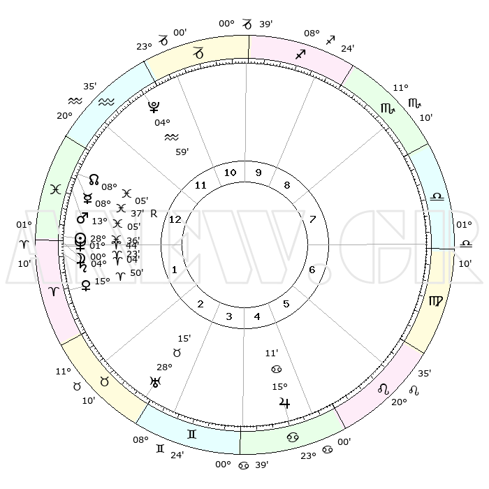 | | ΘΕΣΕΙΣ ΠΛΑΝΗΤΩΝ ΑΣΤΡΟΛΟΓΙΚΟΥ ΧΑΡΤΗ ΤΗΣ ΣΤΙΓΜΗΣ ΑΥΤΗΣ | | | | Πλανήτης | Ζώδιο | Μοίρες | Δεκαήμ. | Σε οίκο | Απόκλιση | | Ακμές των οίκων | | Ηλιος | Ιχθείς | 28°31' | Τρίτο | 1 | 00 S 35 | | 1ος | 18°56' | Υδροχόος | | Σελήνη | Ιχθείς | 29°19' | Τρίτο | 1 | 01 N 25 | | 2ος | 04°44' | Κριός | | Ερμής | Ιχθείς | 08°38'R | Πρώτο | 1 | 07 S 02 | | 3ος | 09°40' | Ταύρος | | Αφροδίτη | Κριός | 15°45' | Δεύτερο | 2 | 05 N 21 | | 4ος | 05°19' | Δίδυμοι | | Αρης | Ιχθείς | 13°01' | Δεύτερο | 1 | 07 S 40 | | 5ος | 27°09' | Δίδυμοι | | Δίας | Καρκίνος | 15°11' | Δεύτερο | 5 | 22 N 56 | | 6ος | 19°42' | Καρκίνος | | Κρόνος | Κριός | 04°03' | Πρώτο | 1 | 00 S 20 | | 7ος | 18°56' | Λέων | | Ουρανός | Ταύρος | 28°15' | Τρίτο | 3 | 19 N 36 | | 8ος | 04°44' | Ζυγός | | Ποσειδώνας | Κριός | 01°43' | Πρώτο | 1 | 00 S 31 | | 9ος | 09°40' | Σκορπιός | | Πλούτωνας | Υδροχόος | 04°59' | Πρώτο | 12 | 22 S 49 | | 10ος | 05°19' | Τοξότης | | Β. Δεσμός | Ιχθείς | 08°05' | Πρώτο | 1 | 08 S 32 | | 11ος | 27°09' | Τοξότης | | Ωροσκόπος | Υδροχόος | 18°56' | Δεύτερο | | | 12ος | 19°42' | Αιγόκερως | | Μεσουράνημα | Τοξότης | 05°19' | Πρώτο | | | |