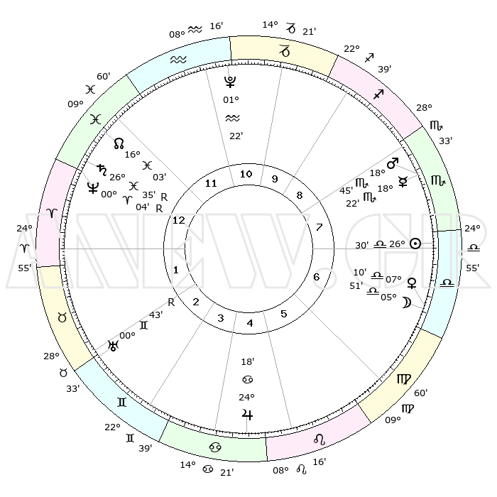 | ΘΕΣΕΙΣ ΠΛΑΝΗΤΩΝ ΑΣΤΡΟΛΟΓΙΚΟΥ ΧΑΡΤΗ ΤΗΣ ΣΤΙΓΜΗΣ ΑΥΤΗΣ | | Πλανήτης | Ζώδιο | Μοίρες | Δεκαήμ. | Σε οίκο | Απόκλιση | | Ακμές των οίκων | Ηλιος | Ζυγός | 26°24' | Τρίτο | 8 | 10 S 11 | | 1ος | 22°55' | Υδροχόος | Σελήνη | Ζυγός | 04°32' | Πρώτο | 7 | 03 S 10 | | 2ος | 08°42' | Κριός | Ερμής | Σκορπιός | 18°13' | Δεύτερο | 9 | 19 S 21 | | 3ος | 12°49' | Ταύρος | Αφροδίτη | Ζυγός | 07°02' | Πρώτο | 7 | 01 S 23 | | 4ος | 07°59' | Δίδυμοι | Αρης | Σκορπιός | 18°40' | Δεύτερο | 9 | 17 S 38 | | 5ος | 29°45' | Δίδυμοι | Δίας | Καρκίνος | 24°17' | Τρίτο | 6 | 21 N 19 | | 6ος | 22°37' | Καρκίνος | Κρόνος | Ιχθείς | 26°36'R | Τρίτο | 1 | 03 S 39 | | 7ος | 22°55' | Λέων | Ουρανός | Δίδυμοι | 00°43'R | Πρώτο | 3 | 20 N 05 | | 8ος | 08°42' | Ζυγός | Ποσειδώνας | Κριός | 00°04'R | Πρώτο | 1 | 01 S 14 | | 9ος | 12°49' | Σκορπιός | Πλούτωνας | Υδροχόος | 01°22' | Πρώτο | 12 | 23 S 32 | | 10ος | 07°59' | Τοξότης | Β. Δεσμός | Ιχθείς | 16°04' | Δεύτερο | 1 | 05 S 30 | | 11ος | 29°45' | Τοξότης | Ωροσκόπος | Υδροχόος | 22°55' | Τρίτο | | | 12ος | 22°37' | Αιγόκερως | Μεσουράνημα | Τοξότης | 07°59' | Πρώτο | | | |