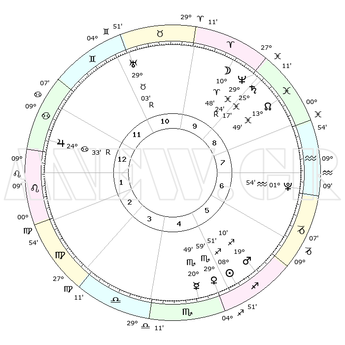 | | ΘΕΣΕΙΣ ΠΛΑΝΗΤΩΝ ΑΣΤΡΟΛΟΓΙΚΟΥ ΧΑΡΤΗ ΤΗΣ ΣΤΙΓΜΗΣ ΑΥΤΗΣ | | | | Πλανήτης | Ζώδιο | Μοίρες | Δεκαήμ. | Σε οίκο | Απόκλιση | | Ακμές των οίκων | | Ηλιος | Τοξότης | 08°49' | Πρώτο | 5 | 21 S 46 | | 1ος | 00°04' | Λέων | | Σελήνη | Κριός | 10°22' | Δεύτερο | 9 | 06 N 08 | | 2ος | 21°06' | Λέων | | Ερμής | Σκορπιός | 20°48' | Τρίτο | 4 | 15 S 27 | | 3ος | 16°09' | Παρθένος | | Αφροδίτη | Σκορπιός | 29°56' | Τρίτο | 5 | 19 S 26 | | 4ος | 17°12' | Ζυγός | | Αρης | Τοξότης | 19°09' | Δεύτερο | 5 | 23 S 39 | | 5ος | 23°15' | Σκορπιός | | Δίας | Καρκίνος | 24°33'R | Τρίτο | 12 | 21 N 22 | | 6ος | 28°56' | Τοξότης | | Κρόνος | Ιχθείς | 25°17' | Τρίτο | 9 | 04 S 03 | | 7ος | 00°04' | Υδροχόος | | Ουρανός | Ταύρος | 29°03'R | Τρίτο | 11 | 19 N 44 | | 8ος | 21°06' | Υδροχόος | | Ποσειδώνας | Ιχθείς | 29°24'R | Τρίτο | 9 | 01 S 29 | | 9ος | 16°09' | Ιχθείς | | Πλούτωνας | Υδροχόος | 01°54' | Πρώτο | 7 | 23 S 24 | | 10ος | 17°12' | Κριός | | Β. Δεσμός | Ιχθείς | 13°49' | Δεύτερο | 8 | 06 S 22 | | 11ος | 23°15' | Ταύρος | | Ωροσκόπος | Λέων | 00°04' | Πρώτο | | | 12ος | 28°56' | Δίδυμοι | | Μεσουράνημα | Κριός | 17°12' | Δεύτερο | | | |
