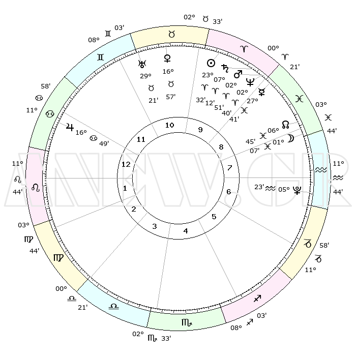 | | ΘΕΣΕΙΣ ΠΛΑΝΗΤΩΝ ΑΣΤΡΟΛΟΓΙΚΟΥ ΧΑΡΤΗ ΤΗΣ ΣΤΙΓΜΗΣ ΑΥΤΗΣ | | | | Πλανήτης | Ζώδιο | Μοίρες | Δεκαήμ. | Σε οίκο | Απόκλιση | | Ακμές των οίκων | | Ηλιος | Κριός | 23°29' | Τρίτο | 10 | 09 N 07 | | 1ος | 24°19' | Καρκίνος | | Σελήνη | Ιχθείς | 00°20' | Πρώτο | 8 | 12 S 01 | | 2ος | 15°01' | Λέων | | Ερμής | Ιχθείς | 27°36' | Τρίτο | 9 | 03 S 17 | | 3ος | 09°19' | Παρθένος | | Αφροδίτη | Ταύρος | 16°52' | Δεύτερο | 11 | 16 N 58 | | 4ος | 09°35' | Ζυγός | | Αρης | Κριός | 02°48' | Πρώτο | 9 | 00 N 12 | | 5ος | 15°40' | Σκορπιός | | Δίας | Καρκίνος | 16°48' | Δεύτερο | 12 | 22 N 45 | | 6ος | 22°20' | Τοξότης | | Κρόνος | Κριός | 07°11' | Πρώτο | 9 | 00 N 53 | | 7ος | 24°19' | Αιγόκερως | | Ουρανός | Ταύρος | 29°21' | Τρίτο | 11 | 19 N 50 | | 8ος | 15°01' | Υδροχόος | | Ποσειδώνας | Κριός | 02°40' | Πρώτο | 9 | 00 S 09 | | 9ος | 09°19' | Ιχθείς | | Πλούτωνας | Υδροχόος | 05°23' | Πρώτο | 7 | 22 S 47 | | 10ος | 09°35' | Κριός | | Β. Δεσμός | Ιχθείς | 06°45' | Πρώτο | 8 | 09 S 02 | | 11ος | 15°40' | Ταύρος | | Ωροσκόπος | Καρκίνος | 24°19' | Τρίτο | | | 12ος | 22°20' | Δίδυμοι | | Μεσουράνημα | Κριός | 09°35' | Πρώτο | | | |