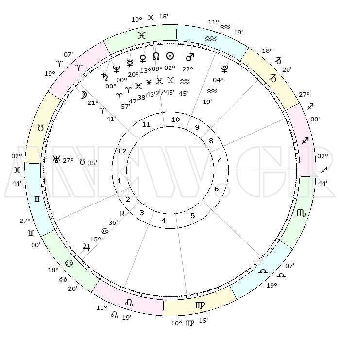 | | ΘΕΣΕΙΣ ΠΛΑΝΗΤΩΝ ΑΣΤΡΟΛΟΓΙΚΟΥ ΧΑΡΤΗ ΤΗΣ ΣΤΙΓΜΗΣ ΑΥΤΗΣ | | | | Πλανήτης | Ζώδιο | Μοίρες | Δεκαήμ. | Σε οίκο | Απόκλιση | | Ακμές των οίκων | | Ηλιος | Ιχθείς | 02°41' | Πρώτο | 11 | 10 S 31 | | 1ος | 26°15' | Κριός | | Σελήνη | Κριός | 20°37' | Τρίτο | 12 | 11 N 19 | | 2ος | 29°31' | Ταύρος | | Ερμής | Ιχθείς | 20°35' | Τρίτο | 12 | 02 S 17 | | 3ος | 23°28' | Δίδυμοι | | Αφροδίτη | Ιχθείς | 13°38' | Δεύτερο | 12 | 07 S 46 | | 4ος | 15°09' | Καρκίνος | | Αρης | Υδροχόος | 22°42' | Τρίτο | 11 | 14 S 59 | | 5ος | 09°12' | Λέων | | Δίας | Καρκίνος | 15°36'R | Δεύτερο | 4 | 22 N 51 | | 6ος | 11°11' | Παρθένος | | Κρόνος | Κριός | 00°56' | Πρώτο | 12 | 01 S 35 | | 7ος | 26°15' | Ζυγός | | Ουρανός | Ταύρος | 27°35' | Τρίτο | 1 | 19 N 26 | | 8ος | 29°31' | Σκορπιός | | Ποσειδώνας | Κριός | 00°47' | Πρώτο | 12 | 00 S 53 | | 9ος | 23°28' | Τοξότης | | Πλούτωνας | Υδροχόος | 04°19' | Πρώτο | 10 | 22 S 55 | | 10ος | 15°09' | Αιγόκερως | | Β. Δεσμός | Ιχθείς | 09°27' | Πρώτο | 11 | 08 S 01 | | 11ος | 09°12' | Υδροχόος | | Ωροσκόπος | Κριός | 26°15' | Τρίτο | | | 12ος | 11°11' | Ιχθείς | | Μεσουράνημα | Αιγόκερως | 15°09' | Δεύτερο | | | |