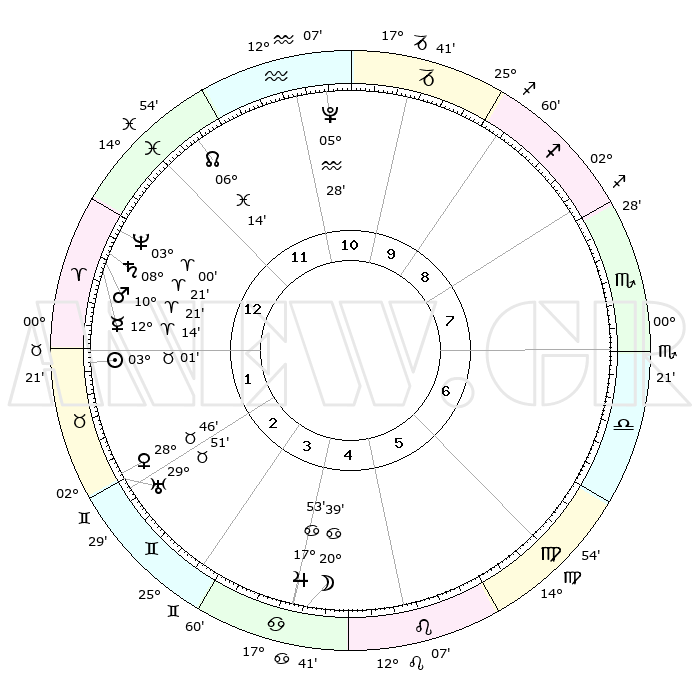 | | ΘΕΣΕΙΣ ΠΛΑΝΗΤΩΝ ΑΣΤΡΟΛΟΓΙΚΟΥ ΧΑΡΤΗ ΤΗΣ ΣΤΙΓΜΗΣ ΑΥΤΗΣ | | | | Πλανήτης | Ζώδιο | Μοίρες | Δεκαήμ. | Σε οίκο | Απόκλιση | | Ακμές των οίκων | | Ηλιος | Ταύρος | 02°57' | Πρώτο | 2 | 12 N 29 | | 1ος | 19°58' | Ιχθείς | | Σελήνη | Καρκίνος | 19°40' | Δεύτερο | 5 | 25 N 44 | | 2ος | 02°30' | Ταύρος | | Ερμής | Κριός | 12°07' | Δεύτερο | 1 | 02 N 27 | | 3ος | 01°31' | Δίδυμοι | | Αφροδίτη | Ταύρος | 28°41' | Τρίτο | 2 | 20 N 23 | | 4ος | 24°21' | Δίδυμοι | | Αρης | Κριός | 10°18' | Δεύτερο | 1 | 03 N 13 | | 5ος | 16°17' | Καρκίνος | | Δίας | Καρκίνος | 17°53' | Δεύτερο | 5 | 22 N 37 | | 6ος | 12°14' | Λέων | | Κρόνος | Κριός | 08°21' | Πρώτο | 1 | 01 N 20 | | 7ος | 19°58' | Παρθένος | | Ουρανός | Ταύρος | 29°51' | Τρίτο | 2 | 19 N 57 | | 8ος | 02°30' | Σκορπιός | | Ποσειδώνας | Κριός | 03°00' | Πρώτο | 1 | 00 S 01 | | 9ος | 01°31' | Τοξότης | | Πλούτωνας | Υδροχόος | 05°28' | Πρώτο | 11 | 22 S 48 | | 10ος | 24°21' | Τοξότης | | Β. Δεσμός | Ιχθείς | 06°14' | Πρώτο | 12 | 09 S 13 | | 11ος | 16°17' | Αιγόκερως | | Ωροσκόπος | Ιχθείς | 19°58' | Δεύτερο | | | 12ος | 12°14' | Υδροχόος | | Μεσουράνημα | Τοξότης | 24°21' | Τρίτο | | | |