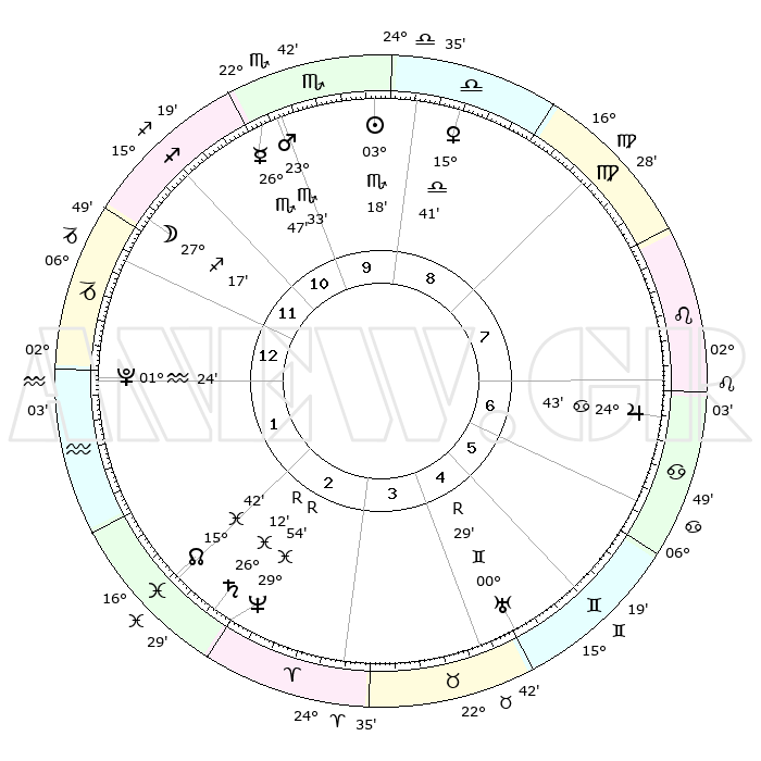 | | ΘΕΣΕΙΣ ΠΛΑΝΗΤΩΝ ΑΣΤΡΟΛΟΓΙΚΟΥ ΧΑΡΤΗ ΤΗΣ ΣΤΙΓΜΗΣ ΑΥΤΗΣ | | | | Πλανήτης | Ζώδιο | Μοίρες | Δεκαήμ. | Σε οίκο | Απόκλιση | | Ακμές των οίκων | | Ηλιος | Σκορπιός | 03°13' | Πρώτο | 10 | 12 S 35 | | 1ος | 27°42' | Τοξότης | | Σελήνη | Τοξότης | 26°10' | Τρίτο | 12 | 28 S 26 | | 2ος | 04°17' | Υδροχόος | | Ερμής | Σκορπιός | 26°41' | Τρίτο | 11 | 22 S 03 | | 3ος | 14°06' | Ιχθείς | | Αφροδίτη | Ζυγός | 15°34' | Δεύτερο | 9 | 04 S 43 | | 4ος | 18°23' | Κριός | | Αρης | Σκορπιός | 23°29' | Τρίτο | 11 | 18 S 58 | | 5ος | 15°05' | Ταύρος | | Δίας | Καρκίνος | 24°43' | Τρίτο | 7 | 21 N 15 | | 6ος | 07°02' | Δίδυμοι | | Κρόνος | Ιχθείς | 26°12'R | Τρίτο | 3 | 03 S 47 | | 7ος | 27°42' | Δίδυμοι | | Ουρανός | Δίδυμοι | 00°29'R | Πρώτο | 5 | 20 N 02 | | 8ος | 04°17' | Λέων | | Ποσειδώνας | Ιχθείς | 29°54'R | Τρίτο | 3 | 01 S 18 | | 9ος | 14°06' | Παρθένος | | Πλούτωνας | Υδροχόος | 01°24' | Πρώτο | 1 | 23 S 31 | | 10ος | 18°23' | Ζυγός | | Β. Δεσμός | Ιχθείς | 15°42' | Δεύτερο | 3 | 05 S 38 | | 11ος | 15°04' | Σκορπιός | | Ωροσκόπος | Τοξότης | 27°42' | Τρίτο | | | 12ος | 07°02' | Τοξότης | | Μεσουράνημα | Ζυγός | 18°23' | Δεύτερο | | | |