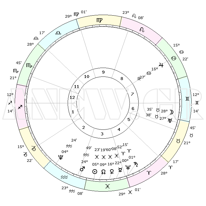 | | ΘΕΣΕΙΣ ΠΛΑΝΗΤΩΝ ΑΣΤΡΟΛΟΓΙΚΟΥ ΧΑΡΤΗ ΤΗΣ ΣΤΙΓΜΗΣ ΑΥΤΗΣ | | | | Πλανήτης | Ζώδιο | Μοίρες | Δεκαήμ. | Σε οίκο | Απόκλιση | | Ακμές των οίκων | | Ηλιος | Ιχθείς | 05°20' | Πρώτο | 4 | 09 S 33 | | 1ος | 24°12' | Σκορπιός | | Σελήνη | Ταύρος | 27°43' | Τρίτο | 7 | 24 N 41 | | 2ος | 24°36' | Τοξότης | | Ερμής | Ιχθείς | 22°07' | Τρίτο | 4 | 01 S 04 | | 3ος | 29°23' | Αιγόκερως | | Αφροδίτη | Ιχθείς | 16°55' | Δεύτερο | 4 | 06 S 29 | | 4ος | 05°13' | Ιχθείς | | Αρης | Υδροχόος | 24°46' | Τρίτο | 3 | 14 S 17 | | 5ος | 06°54' | Κριός | | Δίας | Καρκίνος | 15°28'R | Δεύτερο | 8 | 22 N 52 | | 6ος | 02°44' | Ταύρος | | Κρόνος | Κριός | 01°15' | Πρώτο | 4 | 01 S 28 | | 7ος | 24°12' | Ταύρος | | Ουρανός | Ταύρος | 27°38' | Τρίτο | 7 | 19 N 27 | | 8ος | 24°36' | Δίδυμοι | | Ποσειδώνας | Κριός | 00°52' | Πρώτο | 4 | 00 S 51 | | 9ος | 29°23' | Καρκίνος | | Πλούτωνας | Υδροχόος | 04°24' | Πρώτο | 3 | 22 S 54 | | 10ος | 05°13' | Παρθένος | | Β. Δεσμός | Ιχθείς | 09°19' | Πρώτο | 4 | 08 S 05 | | 11ος | 06°54' | Ζυγός | | Ωροσκόπος | Σκορπιός | 24°12' | Τρίτο | | | 12ος | 02°44' | Σκορπιός | | Μεσουράνημα | Παρθένος | 05°13' | Πρώτο | | | |