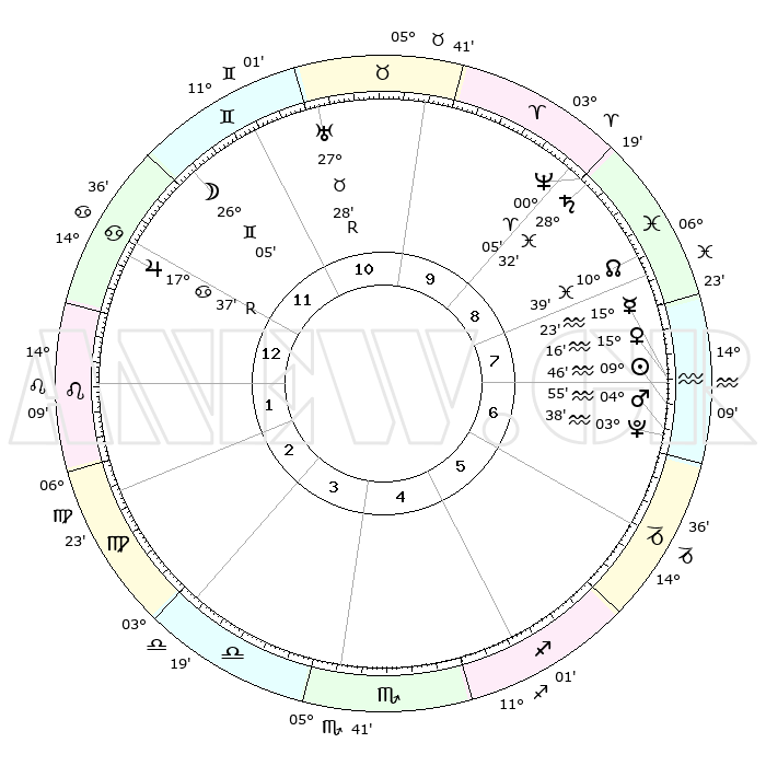 | | ΘΕΣΕΙΣ ΠΛΑΝΗΤΩΝ ΑΣΤΡΟΛΟΓΙΚΟΥ ΧΑΡΤΗ ΤΗΣ ΣΤΙΓΜΗΣ ΑΥΤΗΣ | | | | Πλανήτης | Ζώδιο | Μοίρες | Δεκαήμ. | Σε οίκο | Απόκλιση | | Ακμές των οίκων | | Ηλιος | Υδροχόος | 09°42' | Πρώτο | 7 | 17 S 49 | | 1ος | 26°22' | Καρκίνος | | Σελήνη | Δίδυμοι | 25°11' | Τρίτο | 12 | 28 N 21 | | 2ος | 17°11' | Λέων | | Ερμής | Υδροχόος | 15°17' | Δεύτερο | 7 | 18 S 10 | | 3ος | 11°45' | Παρθένος | | Αφροδίτη | Υδροχόος | 15°11' | Δεύτερο | 7 | 17 S 33 | | 4ος | 12°18' | Ζυγός | | Αρης | Υδροχόος | 04°52' | Πρώτο | 7 | 20 S 03 | | 5ος | 18°24' | Σκορπιός | | Δίας | Καρκίνος | 17°38'R | Δεύτερο | 12 | 22 N 34 | | 6ος | 24°43' | Τοξότης | | Κρόνος | Ιχθείς | 28°31' | Τρίτο | 9 | 02 S 35 | | 7ος | 26°22' | Αιγόκερως | | Ουρανός | Ταύρος | 27°28'R | Τρίτο | 11 | 19 N 24 | | 8ος | 17°11' | Υδροχόος | | Ποσειδώνας | Κριός | 00°05' | Πρώτο | 9 | 01 S 11 | | 9ος | 11°45' | Ιχθείς | | Πλούτωνας | Υδροχόος | 03°38' | Πρώτο | 7 | 23 S 02 | | 10ος | 12°18' | Κριός | | Β. Δεσμός | Ιχθείς | 10°39' | Δεύτερο | 8 | 07 S 34 | | 11ος | 18°24' | Ταύρος | | Ωροσκόπος | Καρκίνος | 26°22' | Τρίτο | | | 12ος | 24°43' | Δίδυμοι | | Μεσουράνημα | Κριός | 12°18' | Δεύτερο | | | |