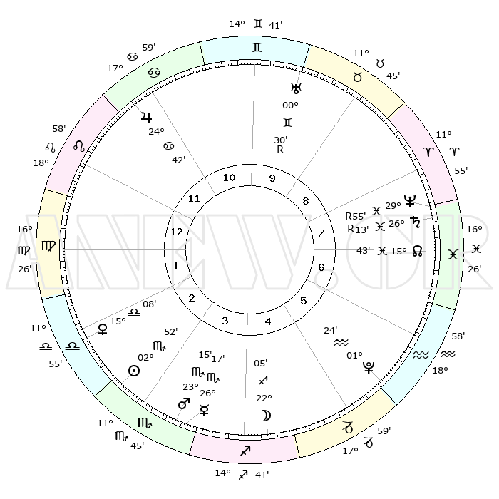 | | ΘΕΣΕΙΣ ΠΛΑΝΗΤΩΝ ΑΣΤΡΟΛΟΓΙΚΟΥ ΧΑΡΤΗ ΤΗΣ ΣΤΙΓΜΗΣ ΑΥΤΗΣ | | | | Πλανήτης | Ζώδιο | Μοίρες | Δεκαήμ. | Σε οίκο | Απόκλιση | | Ακμές των οίκων | | Ηλιος | Σκορπιός | 02°28' | Πρώτο | 7 | 12 S 19 | | 1ος | 23°36' | Κριός | | Σελήνη | Τοξότης | 17°11' | Δεύτερο | 8 | 27 S 55 | | 2ος | 27°36' | Ταύρος | | Ερμής | Σκορπιός | 25°48' | Τρίτο | 7 | 21 S 48 | | 3ος | 21°51' | Δίδυμοι | | Αφροδίτη | Ζυγός | 14°37' | Δεύτερο | 6 | 04 S 21 | | 4ος | 13°33' | Καρκίνος | | Αρης | Σκορπιός | 22°57' | Τρίτο | 7 | 18 S 50 | | 5ος | 07°22' | Λέων | | Δίας | Καρκίνος | 24°41' | Τρίτο | 4 | 21 N 15 | | 6ος | 08°50' | Παρθένος | | Κρόνος | Ιχθείς | 26°15'R | Τρίτο | 12 | 03 S 46 | | 7ος | 23°36' | Ζυγός | | Ουρανός | Δίδυμοι | 00°30'R | Πρώτο | 2 | 20 N 03 | | 8ος | 27°36' | Σκορπιός | | Ποσειδώνας | Ιχθείς | 29°55'R | Τρίτο | 12 | 01 S 17 | | 9ος | 21°51' | Τοξότης | | Πλούτωνας | Υδροχόος | 01°24' | Πρώτο | 10 | 23 S 32 | | 10ος | 13°33' | Αιγόκερως | | Β. Δεσμός | Ιχθείς | 15°44' | Δεύτερο | 12 | 05 S 37 | | 11ος | 07°22' | Υδροχόος | | Ωροσκόπος | Κριός | 23°36' | Τρίτο | | | 12ος | 08°50' | Ιχθείς | | Μεσουράνημα | Αιγόκερως | 13°33' | Δεύτερο | | | |