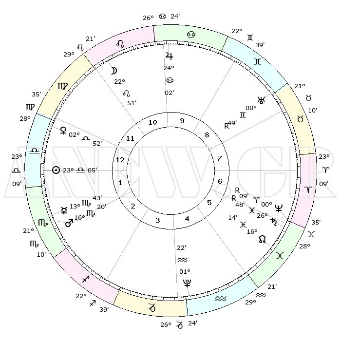 | ΘΕΣΕΙΣ ΠΛΑΝΗΤΩΝ ΑΣΤΡΟΛΟΓΙΚΟΥ ΧΑΡΤΗ ΤΗΣ ΣΤΙΓΜΗΣ ΑΥΤΗΣ | | Πλανήτης | Ζώδιο | Μοίρες | Δεκαήμ. | Σε οίκο | Απόκλιση | | Ακμές των οίκων | Ηλιος | Ζυγός | 22°50' | Τρίτο | 3 | 08 S 53 | | 1ος | 12°48' | Λέων | Σελήνη | Λέων | 19°46' | Δεύτερο | 1 | 17 N 14 | | 2ος | 04°53' | Παρθένος | Ερμής | Σκορπιός | 13°23' | Δεύτερο | 4 | 17 S 36 | | 3ος | 01°39' | Ζυγός | Αφροδίτη | Ζυγός | 02°34' | Πρώτο | 3 | 00 N 22 | | 4ος | 03°56' | Σκορπιός | Αρης | Σκορπιός | 16°10' | Δεύτερο | 4 | 16 S 54 | | 5ος | 09°21' | Τοξότης | Δίας | Καρκίνος | 24°01' | Τρίτο | 12 | 21 N 21 | | 6ος | 13°07' | Αιγόκερως | Κρόνος | Ιχθείς | 26°49'R | Τρίτο | 8 | 03 S 33 | | 7ος | 12°48' | Υδροχόος | Ουρανός | Δίδυμοι | 00°50'R | Πρώτο | 10 | 20 N 07 | | 8ος | 04°53' | Ιχθείς | Ποσειδώνας | Κριός | 00°09'R | Πρώτο | 8 | 01 S 12 | | 9ος | 01°39' | Κριός | Πλούτωνας | Υδροχόος | 01°22' | Πρώτο | 6 | 23 S 32 | | 10ος | 03°56' | Ταύρος | Β. Δεσμός | Ιχθείς | 16°15' | Δεύτερο | 8 | 05 S 25 | | 11ος | 09°21' | Δίδυμοι | Ωροσκόπος | Λέων | 12°48' | Δεύτερο | | | 12ος | 13°07' | Καρκίνος | Μεσουράνημα | Ταύρος | 03°56' | Πρώτο | | | |