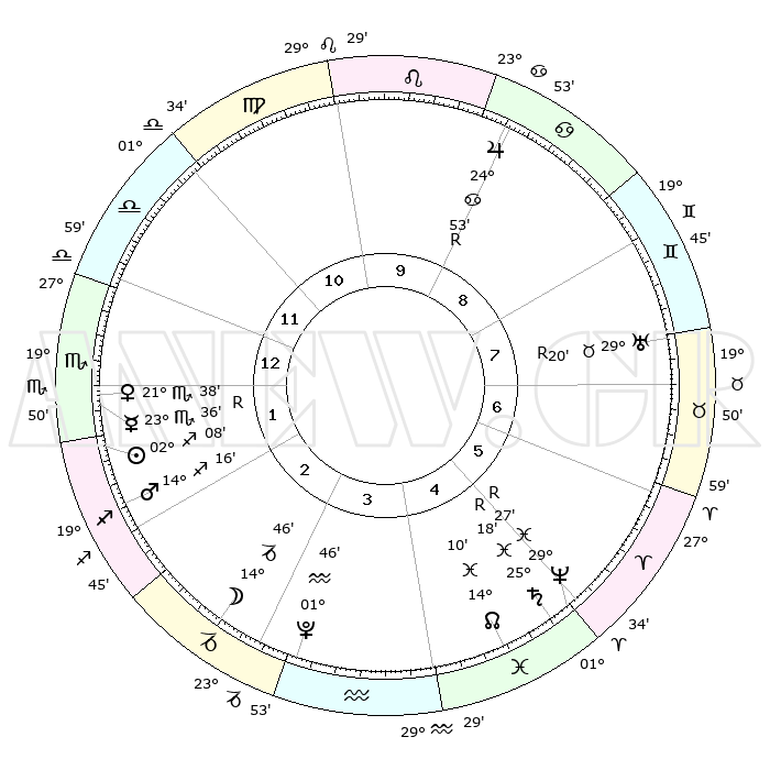 | | ΘΕΣΕΙΣ ΠΛΑΝΗΤΩΝ ΑΣΤΡΟΛΟΓΙΚΟΥ ΧΑΡΤΗ ΤΗΣ ΣΤΙΓΜΗΣ ΑΥΤΗΣ | | | | Πλανήτης | Ζώδιο | Μοίρες | Δεκαήμ. | Σε οίκο | Απόκλιση | | Ακμές των οίκων | | Ηλιος | Τοξότης | 02°07' | Πρώτο | 1 | 20 S 35 | | 1ος | 16°37' | Σκορπιός | | Σελήνη | Αιγόκερως | 14°38' | Δεύτερο | 2 | 26 S 57 | | 2ος | 16°14' | Τοξότης | | Ερμής | Σκορπιός | 23°37'R | Τρίτο | 1 | 17 S 02 | | 3ος | 19°56' | Αιγόκερως | | Αφροδίτη | Σκορπιός | 21°37' | Τρίτο | 1 | 17 S 15 | | 4ος | 25°19' | Υδροχόος | | Αρης | Τοξότης | 14°15' | Δεύτερο | 1 | 23 S 06 | | 5ος | 27°38' | Ιχθείς | | Δίας | Καρκίνος | 24°53'R | Τρίτο | 9 | 21 N 17 | | 6ος | 24°28' | Κριός | | Κρόνος | Ιχθείς | 25°18'R | Τρίτο | 4 | 04 S 04 | | 7ος | 16°37' | Ταύρος | | Ουρανός | Ταύρος | 29°20'R | Τρίτο | 7 | 19 N 48 | | 8ος | 16°14' | Δίδυμοι | | Ποσειδώνας | Ιχθείς | 29°27'R | Τρίτο | 5 | 01 S 28 | | 9ος | 19°55' | Καρκίνος | | Πλούτωνας | Υδροχόος | 01°46' | Πρώτο | 3 | 23 S 26 | | 10ος | 25°19' | Λέων | | Β. Δεσμός | Ιχθείς | 14°10' | Δεύτερο | 4 | 06 S 14 | | 11ος | 27°38' | Παρθένος | | Ωροσκόπος | Σκορπιός | 16°37' | Δεύτερο | | | 12ος | 24°28' | Ζυγός | | Μεσουράνημα | Λέων | 25°19' | Τρίτο | | | |