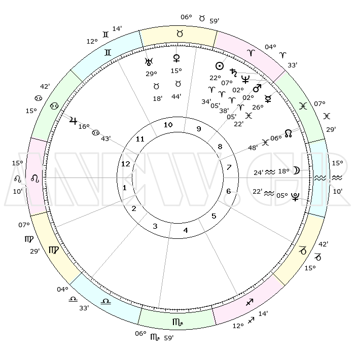 | | ΘΕΣΕΙΣ ΠΛΑΝΗΤΩΝ ΑΣΤΡΟΛΟΓΙΚΟΥ ΧΑΡΤΗ ΤΗΣ ΣΤΙΓΜΗΣ ΑΥΤΗΣ | | | | Πλανήτης | Ζώδιο | Μοίρες | Δεκαήμ. | Σε οίκο | Απόκλιση | | Ακμές των οίκων | | Ηλιος | Κριός | 22°30' | Τρίτο | 10 | 08 N 45 | | 1ος | 24°07' | Καρκίνος | | Σελήνη | Υδροχόος | 17°29' | Δεύτερο | 8 | 17 S 20 | | 2ος | 14°49' | Λέων | | Ερμής | Ιχθείς | 26°16' | Τρίτο | 9 | 03 S 46 | | 3ος | 09°05' | Παρθένος | | Αφροδίτη | Ταύρος | 15°39' | Δεύτερο | 11 | 16 N 34 | | 4ος | 09°19' | Ζυγός | | Αρης | Κριός | 02°01' | Πρώτο | 9 | 00 S 07 | | 5ος | 15°25' | Σκορπιός | | Δίας | Καρκίνος | 16°42' | Δεύτερο | 12 | 22 N 46 | | 6ος | 22°06' | Τοξότης | | Κρόνος | Κριός | 07°04' | Πρώτο | 9 | 00 N 50 | | 7ος | 24°07' | Αιγόκερως | | Ουρανός | Ταύρος | 29°18' | Τρίτο | 11 | 19 N 50 | | 8ος | 14°49' | Υδροχόος | | Ποσειδώνας | Κριός | 02°38' | Πρώτο | 9 | 00 S 09 | | 9ος | 09°05' | Ιχθείς | | Πλούτωνας | Υδροχόος | 05°22' | Πρώτο | 7 | 22 S 47 | | 10ος | 09°19' | Κριός | | Β. Δεσμός | Ιχθείς | 06°48' | Πρώτο | 8 | 09 S 01 | | 11ος | 15°25' | Ταύρος | | Ωροσκόπος | Καρκίνος | 24°07' | Τρίτο | | | 12ος | 22°06' | Δίδυμοι | | Μεσουράνημα | Κριός | 09°19' | Πρώτο | | | |