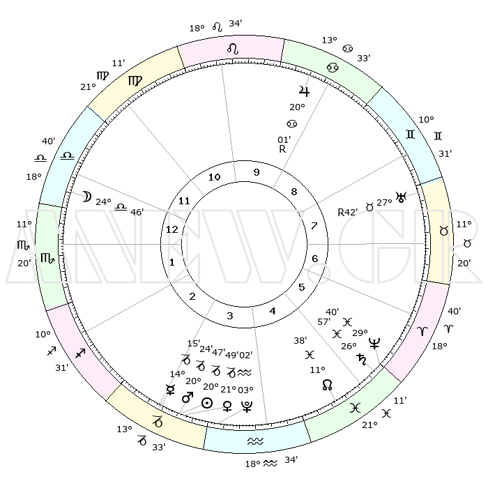 | | ΘΕΣΕΙΣ ΠΛΑΝΗΤΩΝ ΑΣΤΡΟΛΟΓΙΚΟΥ ΧΑΡΤΗ ΤΗΣ ΣΤΙΓΜΗΣ ΑΥΤΗΣ | | | | Πλανήτης | Ζώδιο | Μοίρες | Δεκαήμ. | Σε οίκο | Απόκλιση | | Ακμές των οίκων | | Ηλιος | Αιγόκερως | 20°09' | Τρίτο | 10 | 21 S 55 | | 1ος | 09°60' | Κριός | | Σελήνη | Ζυγός | 17°13' | Δεύτερο | 7 | 09 S 36 | | 2ος | 17°44' | Ταύρος | | Ερμής | Αιγόκερως | 13°16' | Δεύτερο | 10 | 24 S 14 | | 3ος | 13°41' | Δίδυμοι | | Αφροδίτη | Αιγόκερως | 21°02' | Τρίτο | 10 | 22 S 37 | | 4ος | 05°38' | Καρκίνος | | Αρης | Αιγόκερως | 19°56' | Δεύτερο | 10 | 22 S 53 | | 5ος | 28°27' | Καρκίνος | | Δίας | Καρκίνος | 20°06'R | Τρίτο | 4 | 22 N 11 | | 6ος | 27°28' | Λέων | | Κρόνος | Ιχθείς | 26°54' | Τρίτο | 12 | 03 S 17 | | 7ος | 09°60' | Ζυγός | | Ουρανός | Ταύρος | 27°43'R | Τρίτο | 2 | 19 N 27 | | 8ος | 17°44' | Σκορπιός | | Ποσειδώνας | Ιχθείς | 29°39' | Τρίτο | 12 | 01 S 21 | | 9ος | 13°41' | Τοξότης | | Πλούτωνας | Υδροχόος | 03°01' | Πρώτο | 11 | 23 S 09 | | 10ος | 05°38' | Αιγόκερως | | Β. Δεσμός | Ιχθείς | 11°40' | Δεύτερο | 12 | 07 S 11 | | 11ος | 28°27' | Αιγόκερως | | Ωροσκόπος | Κριός | 09°60' | Πρώτο | | | 12ος | 27°28' | Υδροχόος | | Μεσουράνημα | Αιγόκερως | 05°38' | Πρώτο | | | |