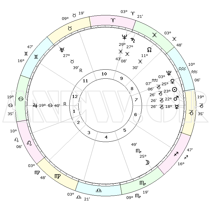 | | ΘΕΣΕΙΣ ΠΛΑΝΗΤΩΝ ΑΣΤΡΟΛΟΓΙΚΟΥ ΧΑΡΤΗ ΤΗΣ ΣΤΙΓΜΗΣ ΑΥΤΗΣ | | | | Πλανήτης | Ζώδιο | Μοίρες | Δεκαήμ. | Σε οίκο | Απόκλιση | | Ακμές των οίκων | | Ηλιος | Αιγόκερως | 23°21' | Τρίτο | 8 | 21 S 25 | | 1ος | 19°59' | Δίδυμοι | | Σελήνη | Σκορπιός | 24°43' | Τρίτο | 6 | 23 S 44 | | 2ος | 11°38' | Καρκίνος | | Ερμής | Αιγόκερως | 18°17' | Δεύτερο | 8 | 23 S 52 | | 3ος | 02°58' | Λέων | | Αφροδίτη | Αιγόκερως | 24°59' | Τρίτο | 8 | 22 S 03 | | 4ος | 27°48' | Λέων | | Αρης | Αιγόκερως | 22°21' | Τρίτο | 8 | 22 S 32 | | 5ος | 29°58' | Παρθένος | | Δίας | Καρκίνος | 19°40'R | Δεύτερο | 2 | 22 N 15 | | 6ος | 10°16' | Σκορπιός | | Κρόνος | Ιχθείς | 27°08' | Τρίτο | 10 | 03 S 11 | | 7ος | 19°59' | Τοξότης | | Ουρανός | Ταύρος | 27°39'R | Τρίτο | 12 | 19 N 27 | | 8ος | 11°38' | Αιγόκερως | | Ποσειδώνας | Ιχθείς | 29°42' | Τρίτο | 10 | 01 S 20 | | 9ος | 02°58' | Υδροχόος | | Πλούτωνας | Υδροχόος | 03°07' | Πρώτο | 9 | 23 S 08 | | 10ος | 27°48' | Υδροχόος | | Β. Δεσμός | Ιχθείς | 11°30' | Δεύτερο | 10 | 07 S 15 | | 11ος | 29°58' | Ιχθείς | | Ωροσκόπος | Δίδυμοι | 19°59' | Δεύτερο | | | 12ος | 10°16' | Ταύρος | | Μεσουράνημα | Υδροχόος | 27°48' | Τρίτο | | | |